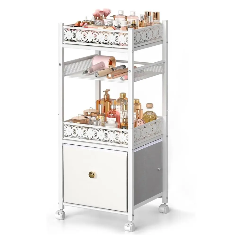 Effortlessly collapse this versatile cart into sliver-thin invisibility for cramped spaces. Three breathable mesh tiers securely cradle contents while promoting airflow and freshness. Confidently haul heavy loads on weather-resistant steel frames, then glide silently across floors with responsive locking wheels. 𝐈𝐧𝐬𝐭𝐚𝐧𝐭 𝐅𝐨𝐥𝐝: The portable lock design folds flat for storage (34.45" L x 11.42" W) with zero wobble, optimizing floor space in tight areas like bathrooms or kitchens. 𝟑-𝐓𝐢𝐞𝐫 𝐁𝐫𝐞𝐚𝐭𝐡𝐚𝐛𝐥𝐞 𝐒𝐭𝐨𝐫𝐚𝐠𝐞: 17"L x 11"W mesh baskets (12.2"H per tier, 2.56" depth) prevent item falls, accelerate drainage, and resist odors for easy cleaning. 𝐑𝐮𝐬𝐭-𝐏𝐫𝐨𝐨𝐟: Anti-scratch, oil-resistant painted steel holds 60 lbs/shelf, ideal for indoor/outdoor use with scratch-free durability. 𝐒𝐦𝐨𝐨𝐭𝐡 𝐌𝐨𝐛𝐢𝐥𝐢𝐭𝐲: 2 lockable 360° wheels + mute rubber casters glide quietly across floors, while a flexible handle ensures effortless steering. 𝐌𝐮𝐥𝐭𝐢 𝐒𝐜𝐞𝐧𝐞 𝐔𝐭𝐢𝐥𝐢𝐭𝐲: Compact 3-tier cart adapts as kitchen storage, bathroom organizer, picnic trolley, or tool rack for clutter free spaces.
