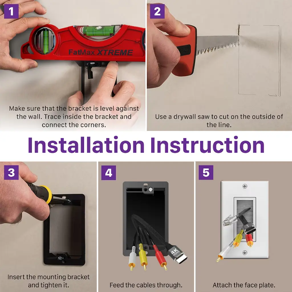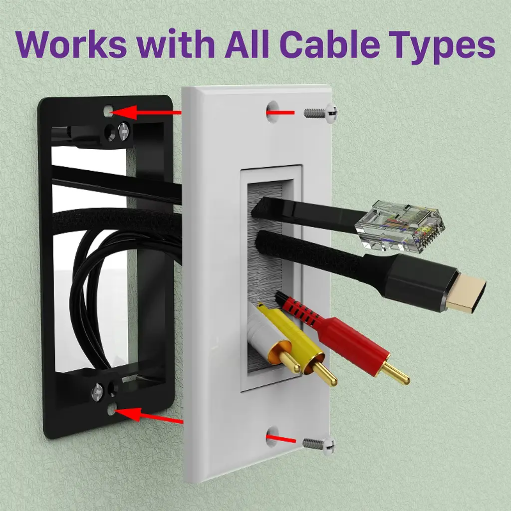 Design Fosmon's low-voltage wall plate mounting Bracket is designed specifically for the installation of low-voltage cables and wires in walls. The backless design accommodates the space needed for speaker wires, coaxial, HDMI and data/communication cables. Perfect for surround sound systems, banana wall plates, HDMI wall plates and coaxial wall plates. Flush Mount Designed to mount wall plates flush with the wall. Easy to Install Installation is as simple as TRACE, CUT and INSTALL. Utilize the inside of the bracket as a guide to trace and cut a hole on the wall. Fully Adjustable Adjusts to fit various wall thicknesses from 1/4" to 1" thick. Specifications 1-gang bracket opening measures 2.125 " x 3.5".Fits wall thicknesses from 1/4" to 1" thick.ABS UL94-V0 material Model: 1 Pack: HD8126; 5 Pack: HD8127; 10 Pack: HD8214