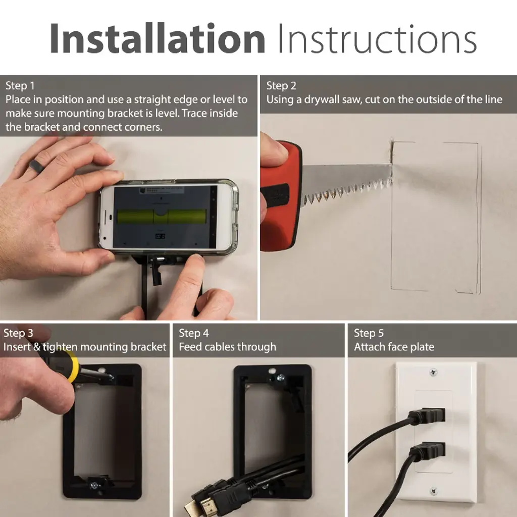 Design Fosmon's low-voltage wall plate mounting Bracket is designed specifically for the installation of low-voltage cables and wires in walls. The backless design accommodates the space needed for speaker wires, coaxial, HDMI and data/communication cables. Perfect for surround sound systems, banana wall plates, HDMI wall plates and coaxial wall plates. Flush Mount Designed to mount wall plates flush with the wall. Easy to Install Installation is as simple as TRACE, CUT and INSTALL. Utilize the inside of the bracket as a guide to trace and cut a hole on the wall. Fully Adjustable Adjusts to fit various wall thicknesses from 1/4" to 1" thick. Specifications 1-gang bracket opening measures 2.125 " x 3.5".Fits wall thicknesses from 1/4" to 1" thick.ABS UL94-V0 material Model: 1 Pack: HD8126; 5 Pack: HD8127; 10 Pack: HD8214