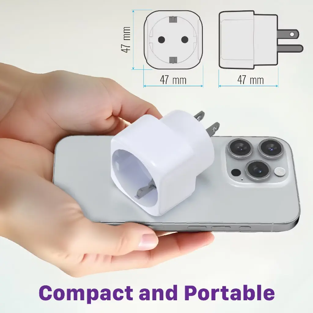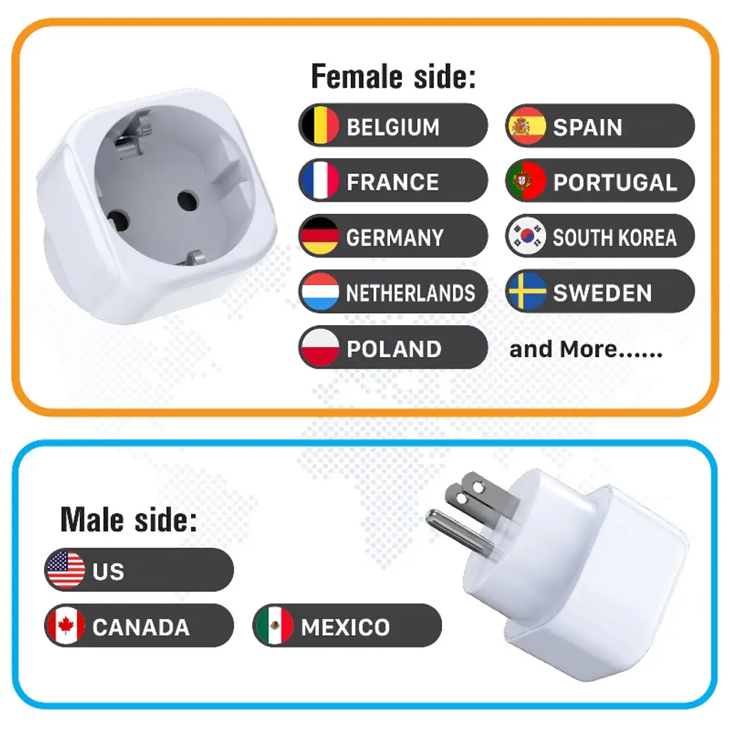 Universal EU to US Adapter Transform your European Type C/E/F plugs into US Type B outlets with this compact and reliable travel adapter. Perfect for travelers, this adapter ensures your devices stay powered while maintaining safety standards. Wide Compatibility Compatible with most 2-pin European plugs (Type C/E/F) and converts them to work with US/North American Type B outlets. Ideal for electronics, chargers, and appliances rated up to 15A/125V. Safe and Reliable Design Built with high-quality fire-resistant materials and featuring a secure grip design, this adapter ensures stable connections and protection for your devices. Note: This is not a voltage converter. Compact and Portable Lightweight and space-saving design makes it perfect for travel. The sleek white finish complements any setting while the durable construction ensures long-lasting performance. Specifications Model: C-10833FLInput: Type C/E/F (European) plugsOutput: Type B (US/North American) socketMaximum Rating: 100-250V/15ACompatible Plug Types: Type C (Euro), Type E (French), Type F (Schuko)Compatible Outlets: Type B (US/North American)Material: Fire-resistant ABS plasticColor: WhiteSafety Certifications: CE, FCC, RoHS compliantDimensions: Compact travel size Package Includes 1x Fosmon EU to US Travel Adapter1x User Manual Model: C-10833FL
