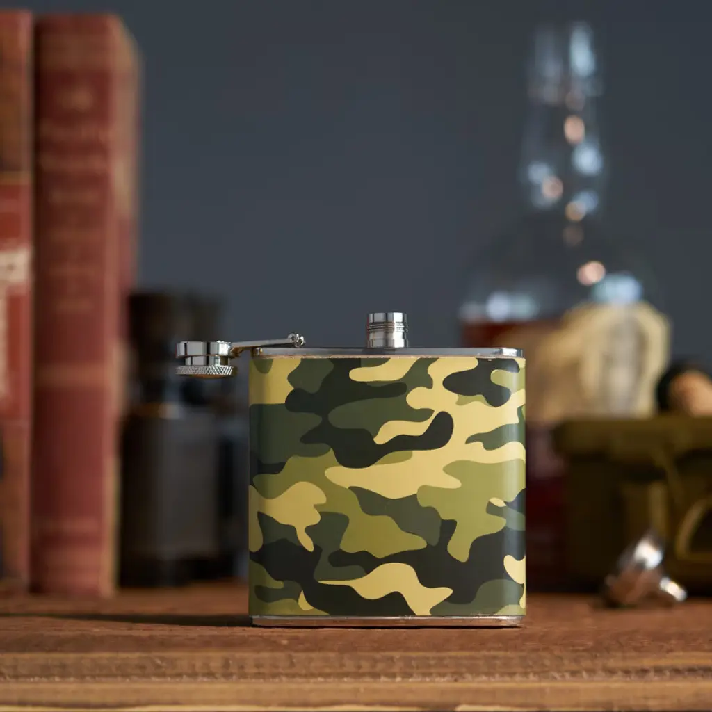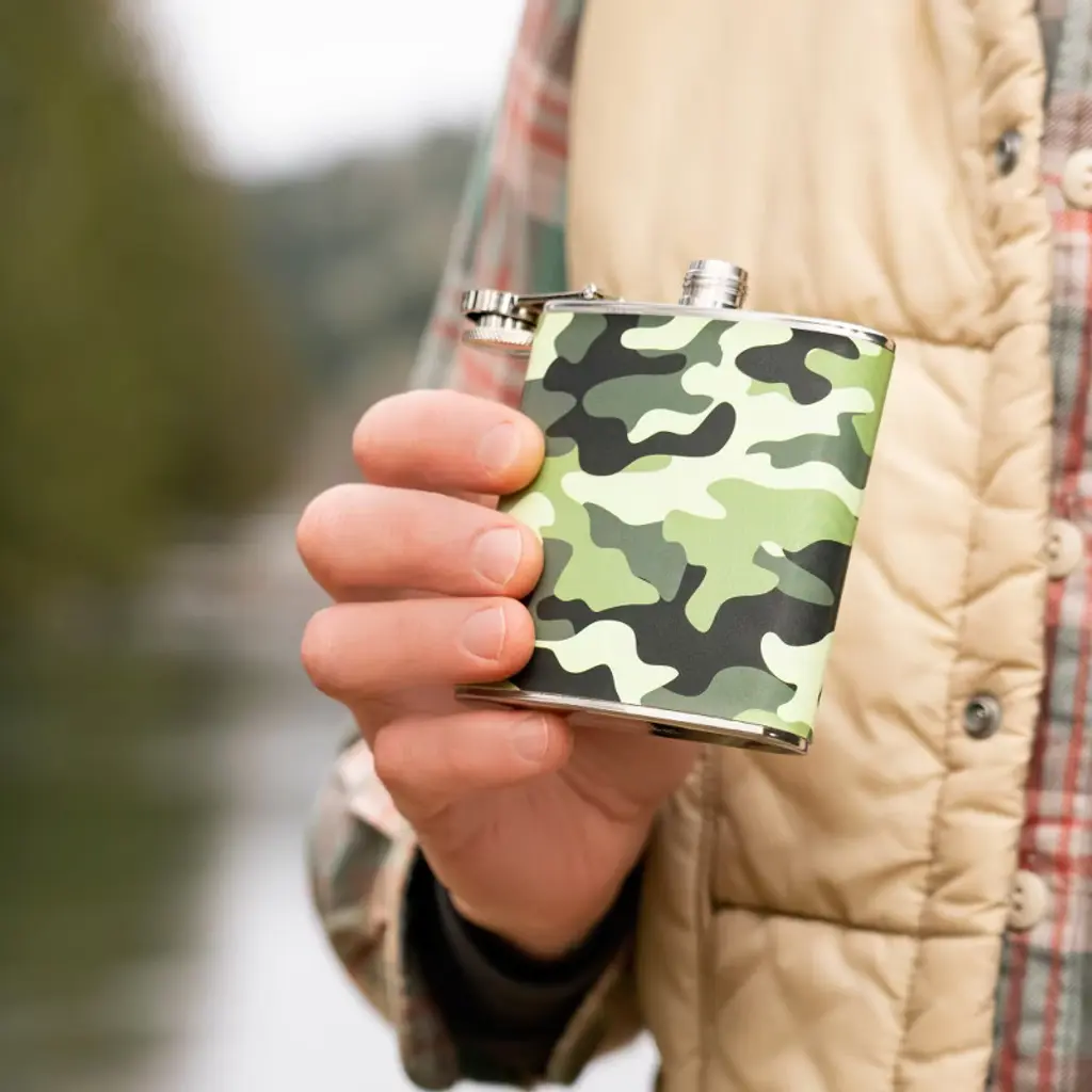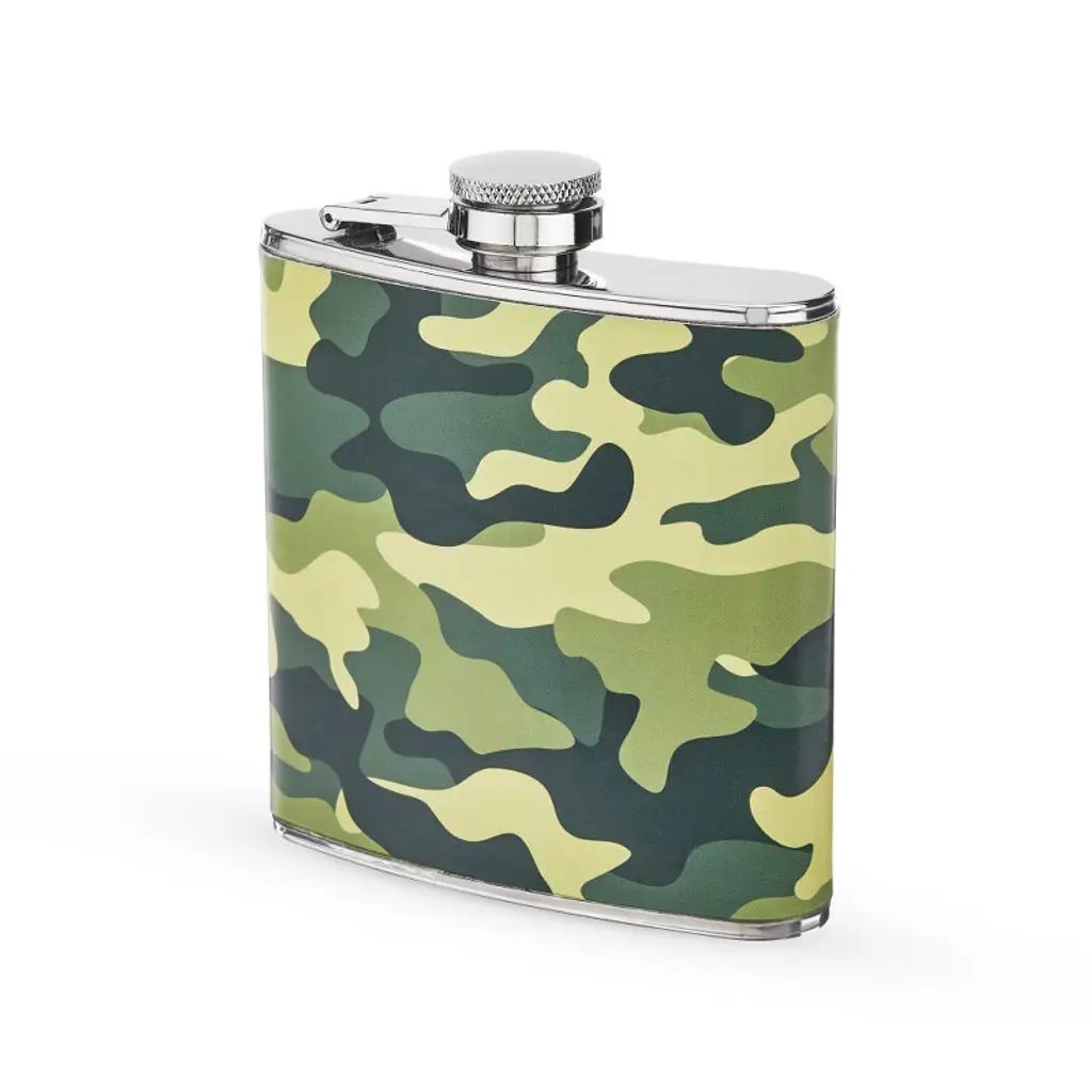 If you are on the hunt for a good time, this flask is for you. Made from stainless steel, it holds 6 ounces of your favorite high-powered beverage.Accommodates 6 oz comfortablyStainless steel constructionWhimsical camo finishIncludes funnelMakes a great giftDisclaimer : Flasks aren't meant for storing alcohol long-term. Leaving liquor in a flask for too long might lead to undesirable flavors. To keep things fresh, finish or replace the contents within a few days. Cheers and happy sipping!