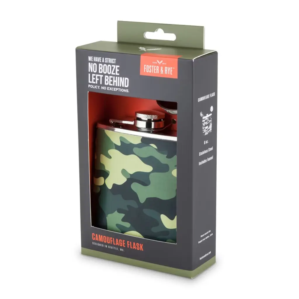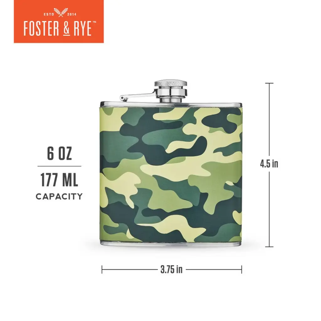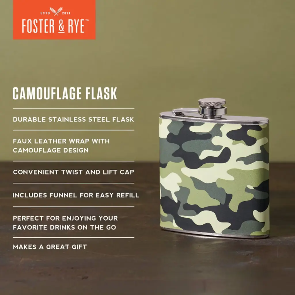 Foster & Rye Camouflage Flask, Whiskey Flask For Men, Stainless Steel Alcohol Flask Faux Leather Wrapped Camo Design, Includes Funnel, 6Oz Set Of 1