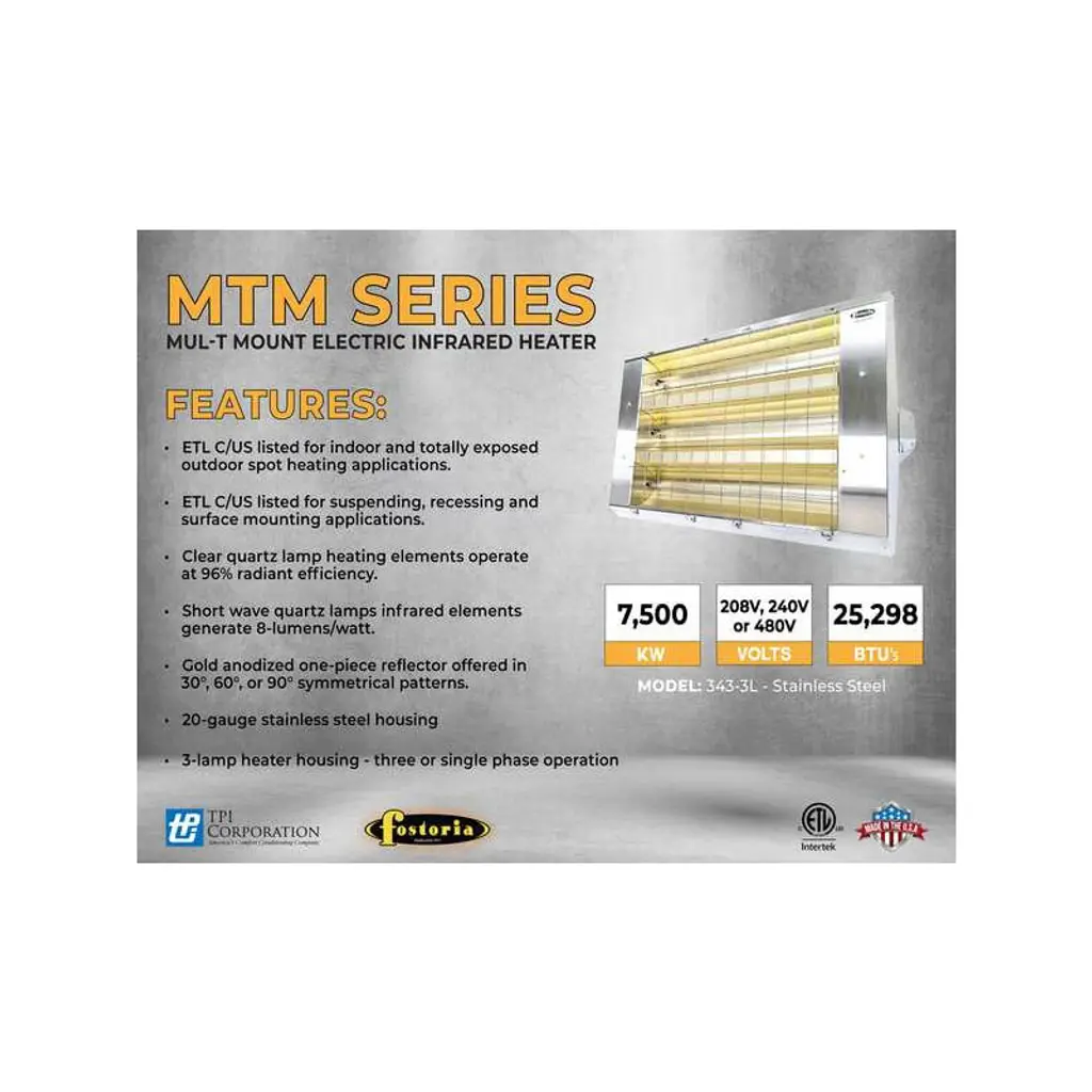 Infrared Quartz Electric Heater, Overall Height Not Applicable, Overall Length 33 in, Overall Width 21 1/2 in, Overall Depth 11 in, Phase 1, 3, Voltage 480V AC, Wattage Output 7500 W, Beam Pattern 60 Degrees , Element Type Quartz Lamp, Housing Color Silver, Housing Material Stainless Steel, Mounting Type Chain Permanent, Recessed, Surface, Suspended, Wall, Grille Depth Not Applicable, Heating Capacity 25,298 BtuH, Heating Method Radiant, Housing Finish Stainless Steel