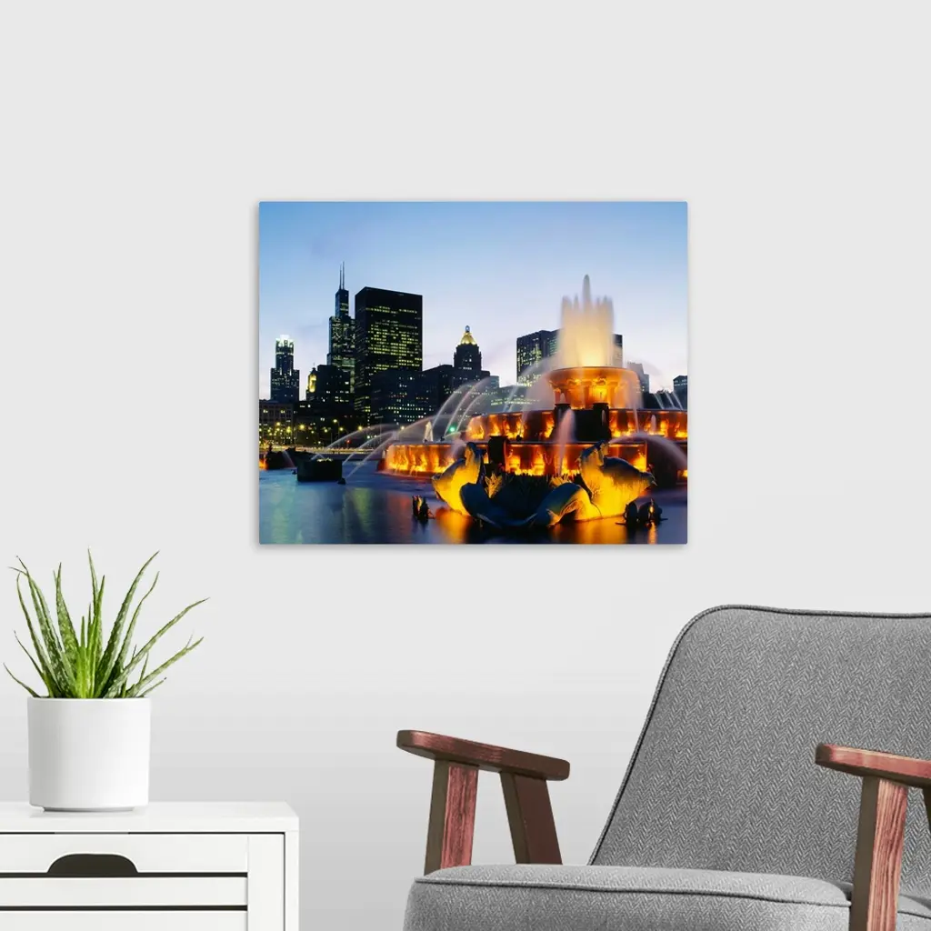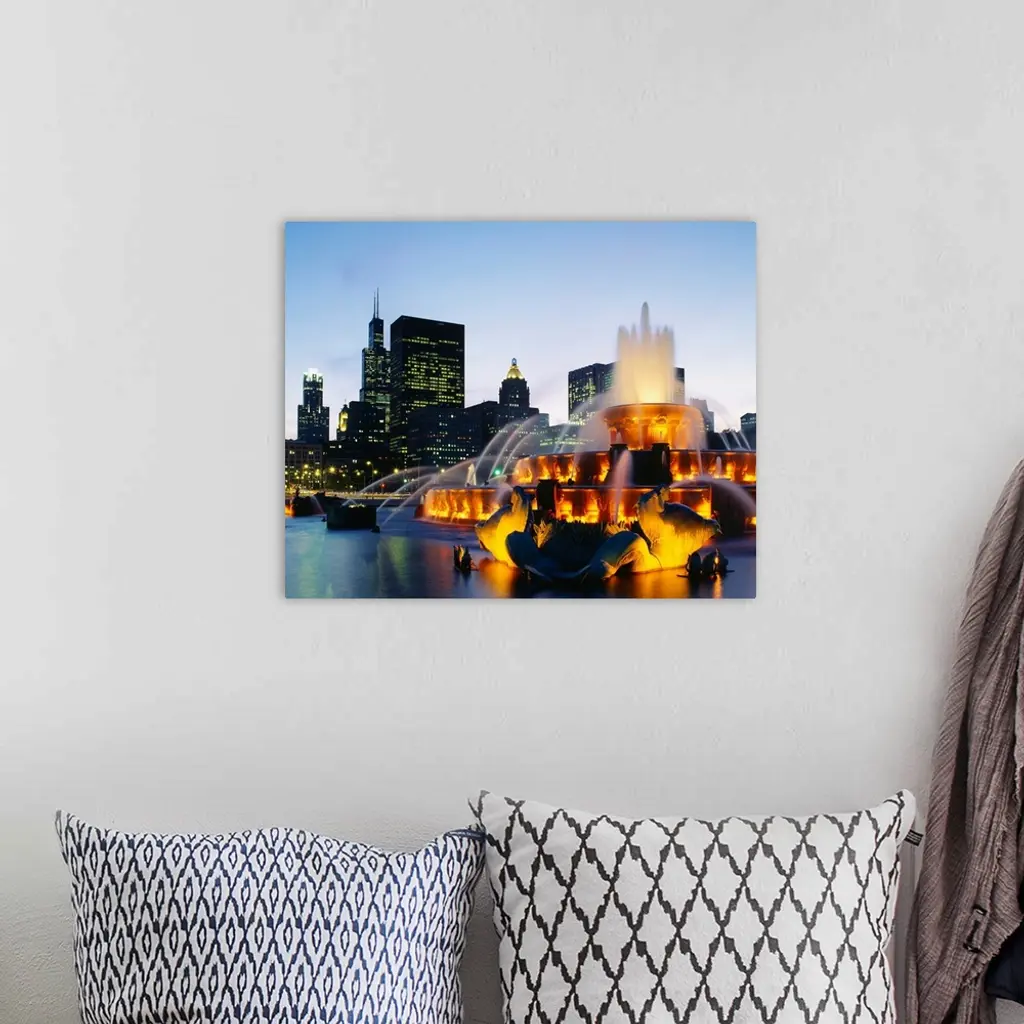 Fountain In A City Lit Up At Night, Buckingham Fountain, Chicago, Illinois