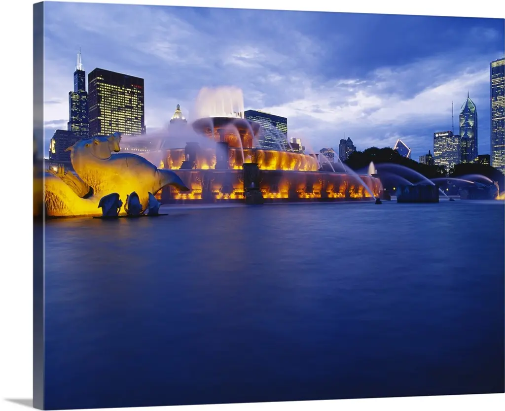 Huge photograph taken of Buckingham Fountain lit up at night as it sprays water in an artful sequence. The background holds the busy skyline of Chicago, Illinois filled with skyscrapers shining brightly.