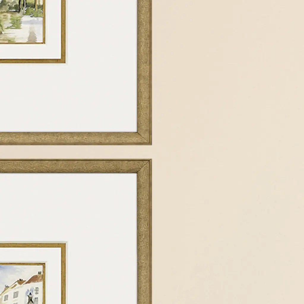 Exclusive hand embellished giclee with gold leaf matting. Framed in an antique gold wood with embossed weave pattern.