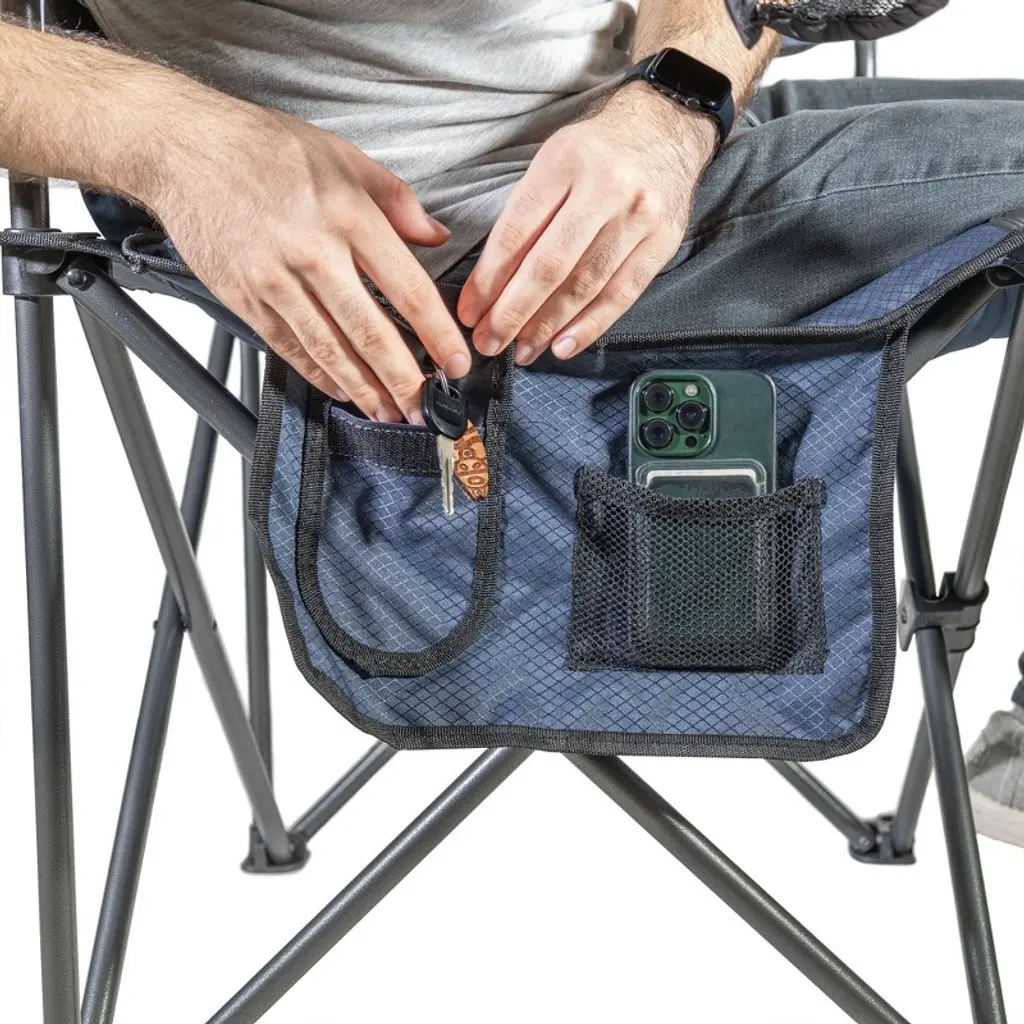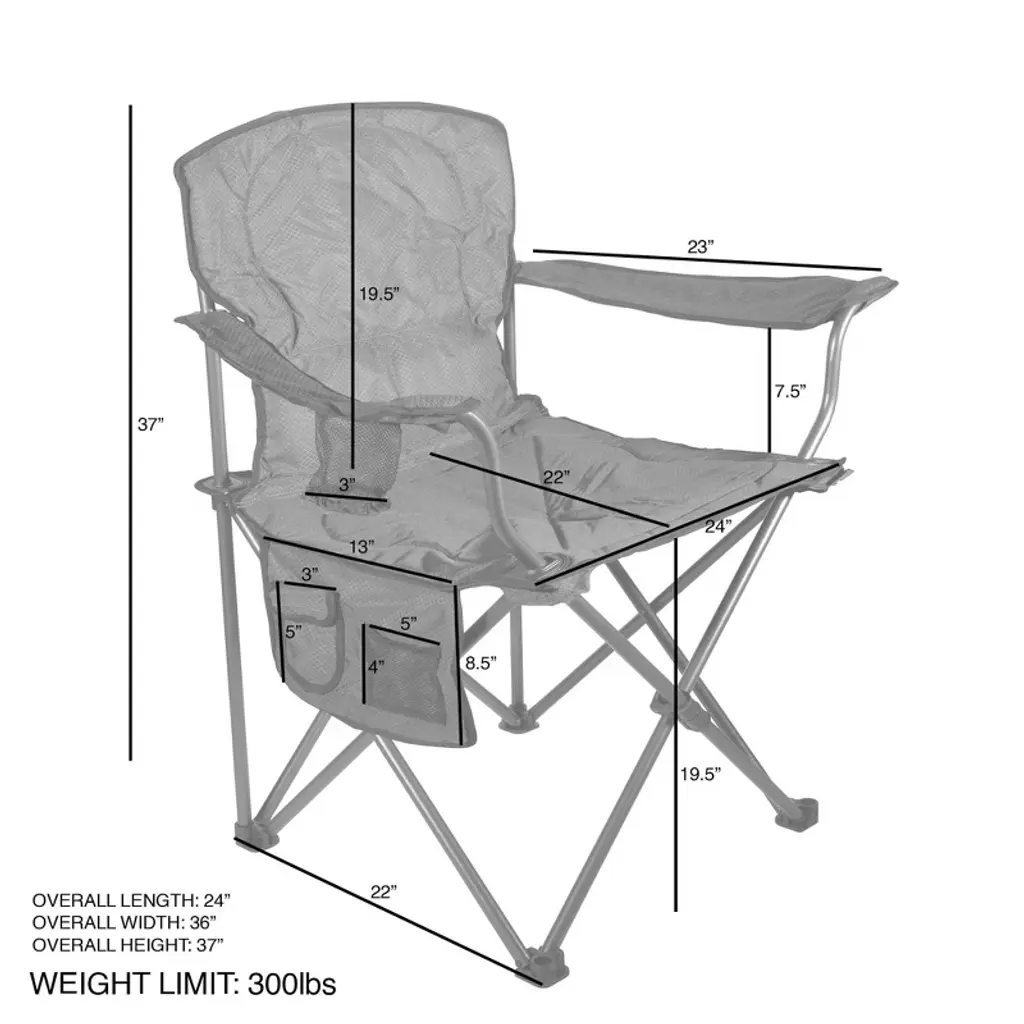Experience unmatched comfort and durability with the Four Seasons Courtyard Oversized Folding Padded Arm Chair. Built with a sturdy steel frame and easy-to-clean polyester fabric, this chair is designed for long-lasting outdoor use. The fully padded seat with built-in lumbar support ensures superior comfort, while the oversized armrests provide extra relaxation during long hours of sitting. Convenience is built in with a cup holder and storage panel, making it perfect for camping, beach trips, tailgating, or backyard lounging. Best of all, the chair folds easily into its own carry bag with strap, so you can take it anywhere with ease!