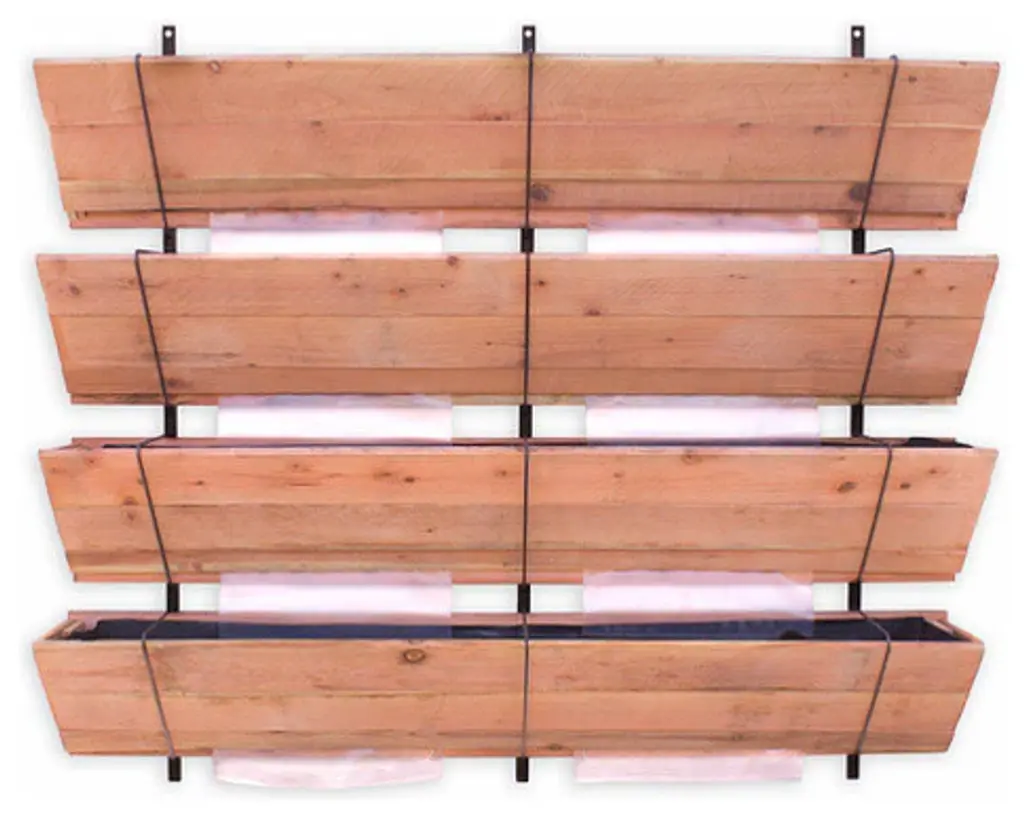 The design of Flower Street Urban Gardens refines the simplicity, durability, functionality, and the aesthetic of what a superior vertical garden should be. Its modular design offers a range of versatile options including the ability to be hung in groups to create a lush living wall. This is a full scale vertical garden that doesn"™t mess around. It brings you all of the practical design features that allow you to produce stunning aesthetic impact. If you"™re looking for a system that has the capacity to grow full sized vegetables in a small space then look no further. In practical application, alternative products can easily stain or erode surfaces. Other systems have limited space for root systems which limits what vegetables (if any) you can grow. Each unit is designed to drain excess water down through its tiers. The bottom drip edge can be angled to direct the water run off away from walls so no calcification or staining occurs. The materials include red cedar which is naturally rot resistant and has an impressively low carbon footprint. Each tier is lined with a BPA free, agricultural grade food liner. The liners are perforated to facilitate the drainage as well as keeping the soil separated from the wood facade. Each bolt-on unit uses three steel mounting brackets to allow the unit to attach directly onto any sound vertical structure. These frames have a designated hole on the top and bottom of the mounting bracket to adhere the unit using the bolts we provide, ensuring ease of assembly and strong structural support.Easy DIY assembly Features a warm aesthetic and is handicap accessible. Meets the needs of novice gardener and the master gardener alikeDesign is decorative and functional making the most out of your space by growing verticallyGreat for growing vegetables, herbs, flowers and succulents on your wall or fence