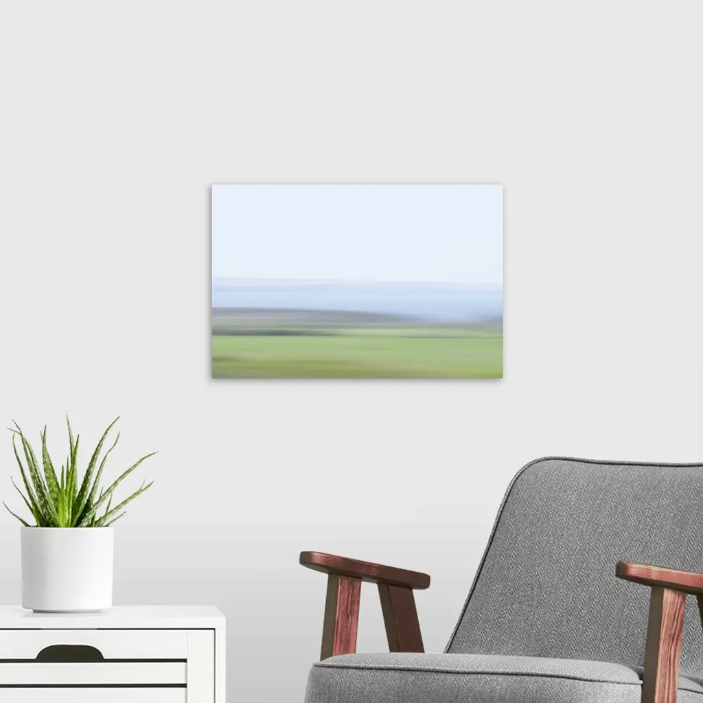 Artistically blurred photo. Delicate colors of a lake and fields early on a hazy morning.