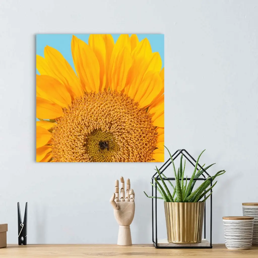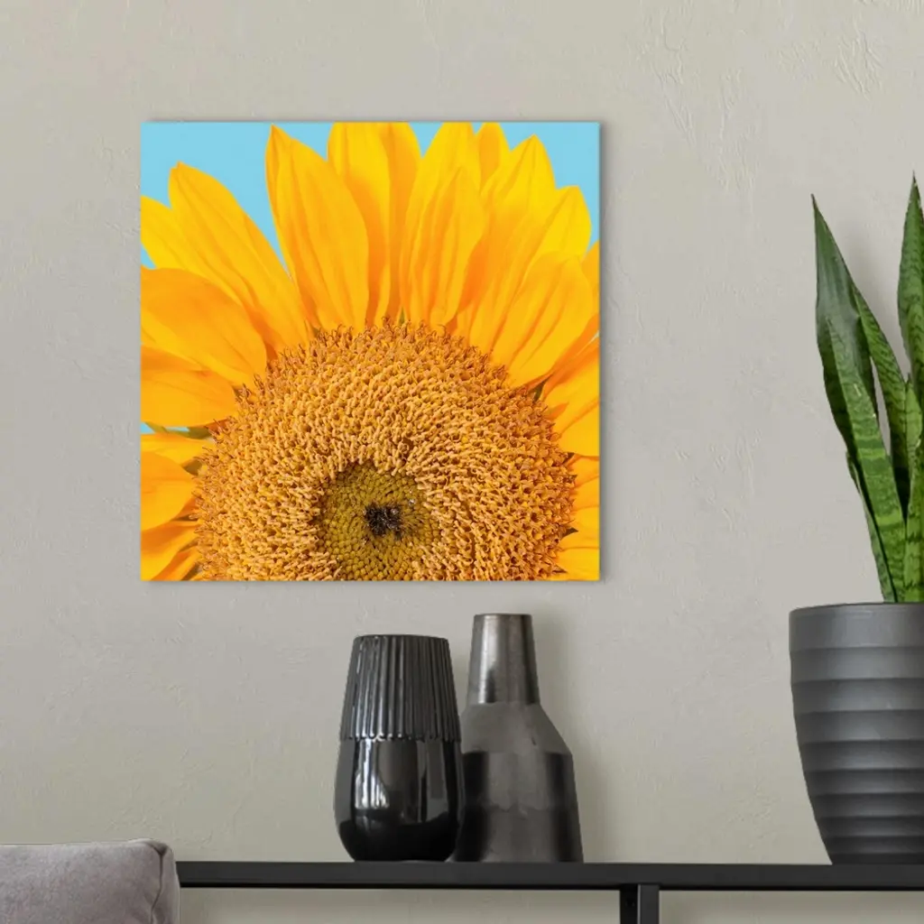 Fragment of a single sunflower head (Helianthus sp.) isolated on blue background. Studio shot.