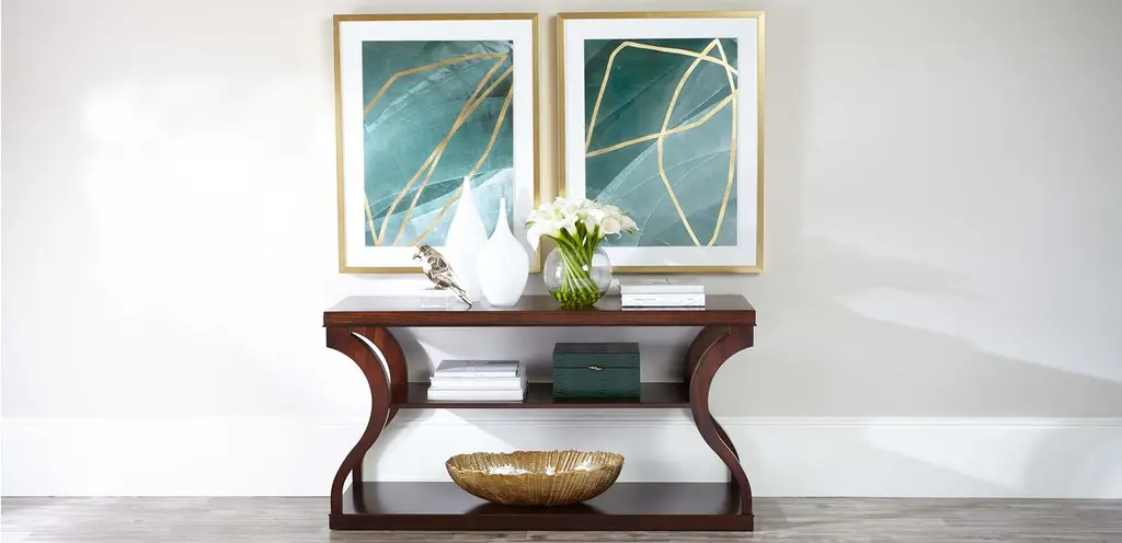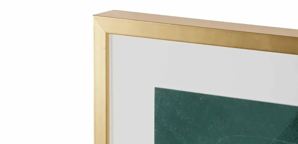 Abstract golden outlines hint at leafy forms, which are further enhanced by the tranquil tones of their emerald green background. Part of a series of two.