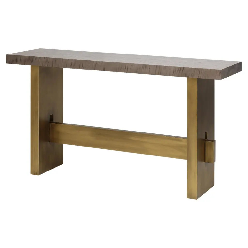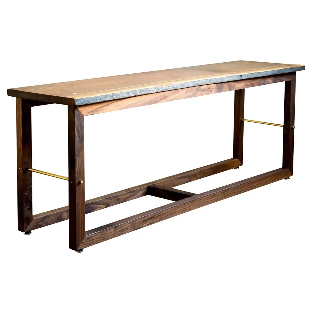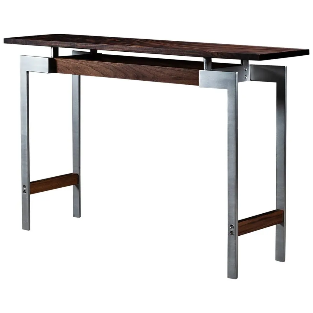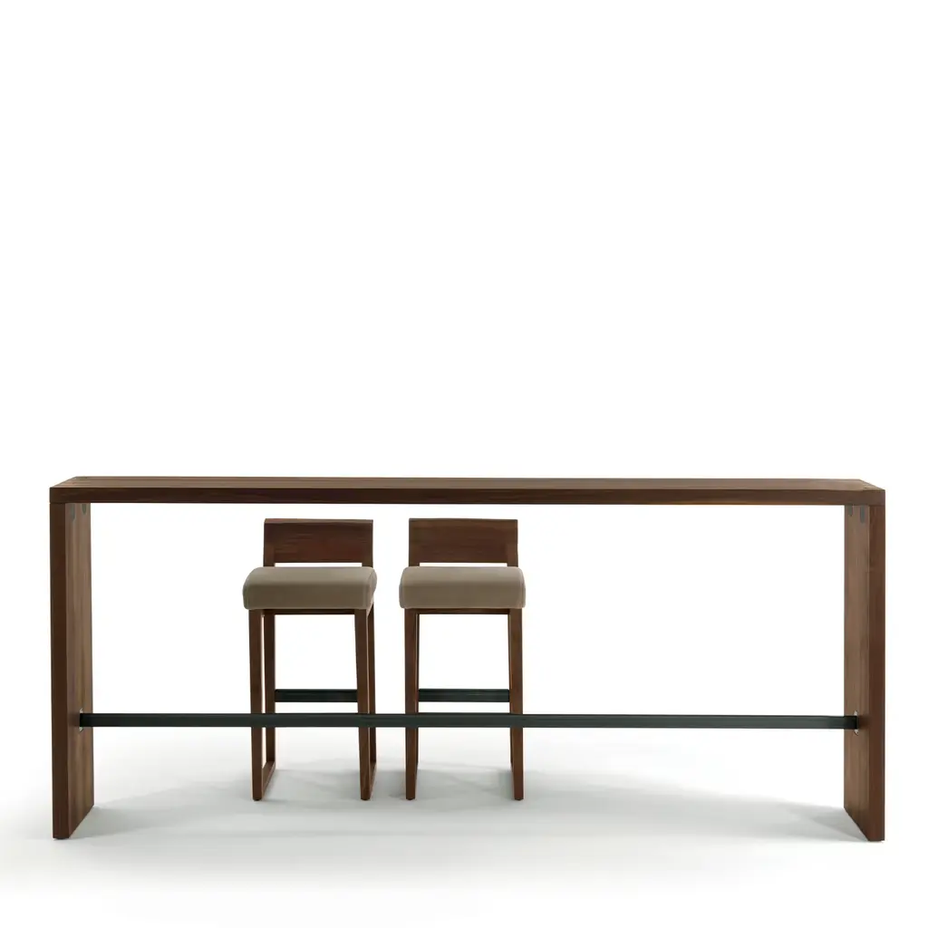 Essentiality is the first word coming to mind when observing this console in oiled knot-free walnut, perfect for complementing a refined bar decor thanks to its generous length and practical footrest bar. Fashioned of sturdy anthracite-gray-lacquered iron, the bar runs horizontally from side to side, favoring prolonged seating experiences.