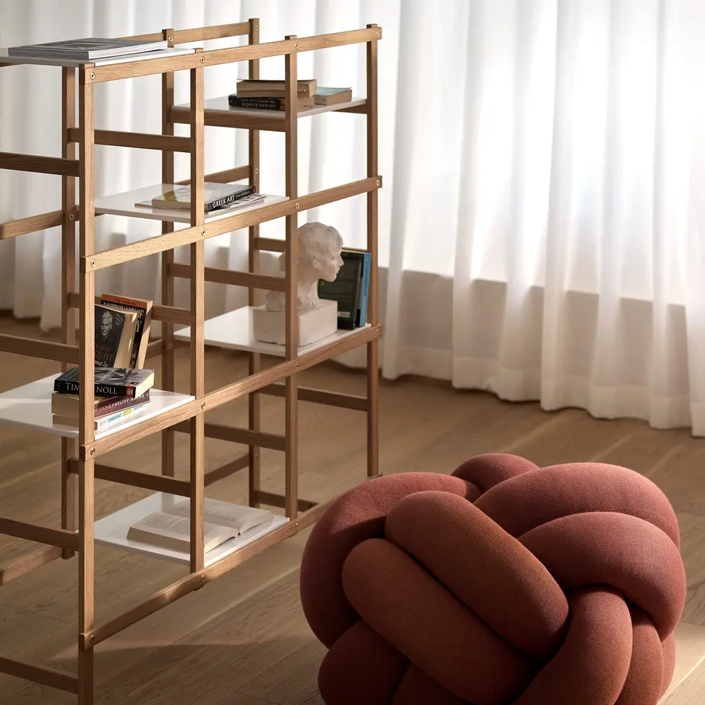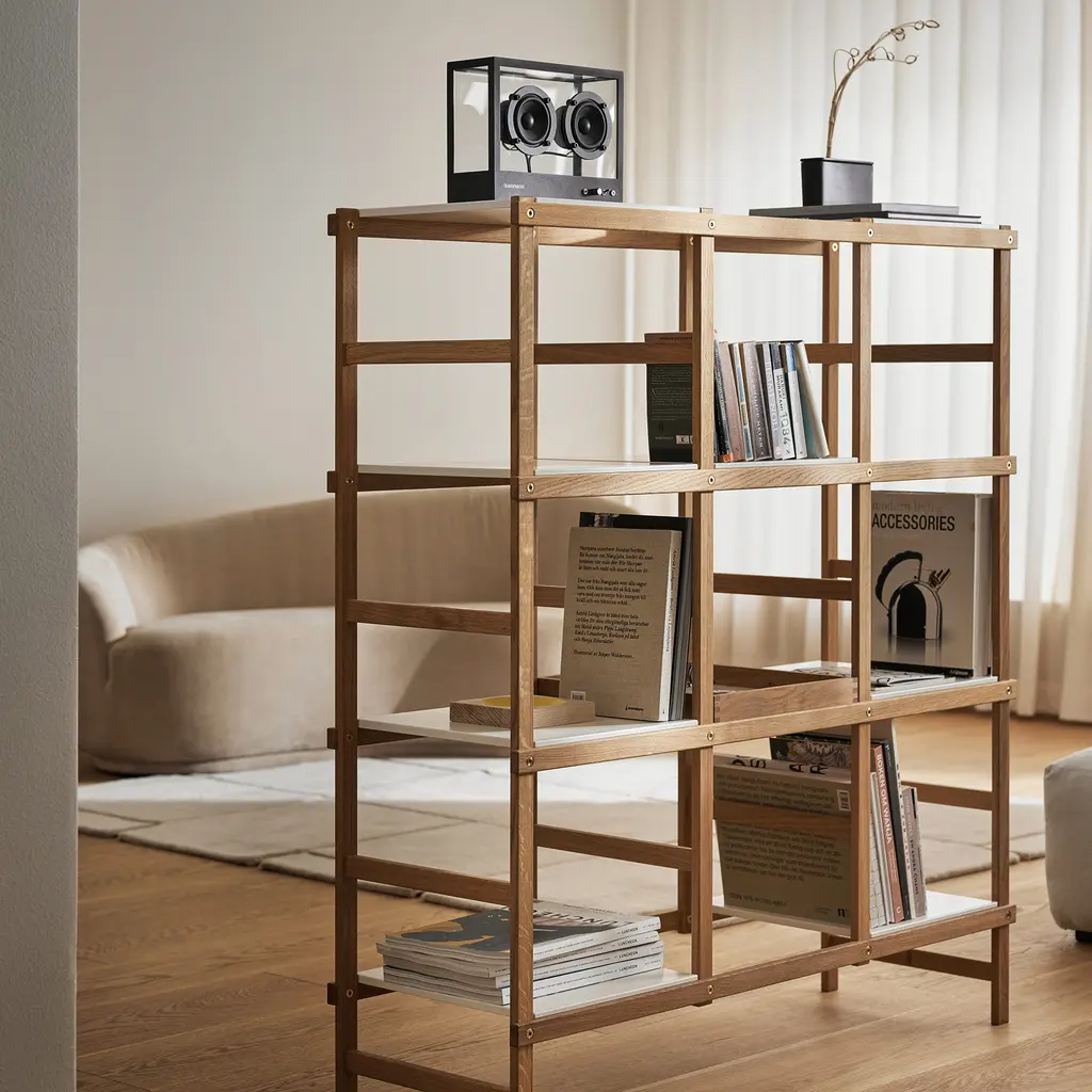 Frame High by Harald Hermanrud seamlessly fits into modern architectural settings that prioritize transparency and natural light. The shelving system can adapt to a variety of needs, from wall-mounted to room-dividing configurations. Not merely a place to stash your belongings, Frame High invites you to showcase art pieces, books, or plants, making each shelf a curated exhibit in your home. Its ingenious grid system holds an array of shelves, trays, and boxes, which can be effortlessly rearranged without tools. The design employs interlocking profiled sticks, offering both structural integrity and a lightweight feel. True to Scandinavian craftsmanship, Frame High is wood-constructed with a meticulous attention to joinery. Exposed solid brass rivet nuts capture and reflect light, bringing an element of insight into the shelving system’s assembly.