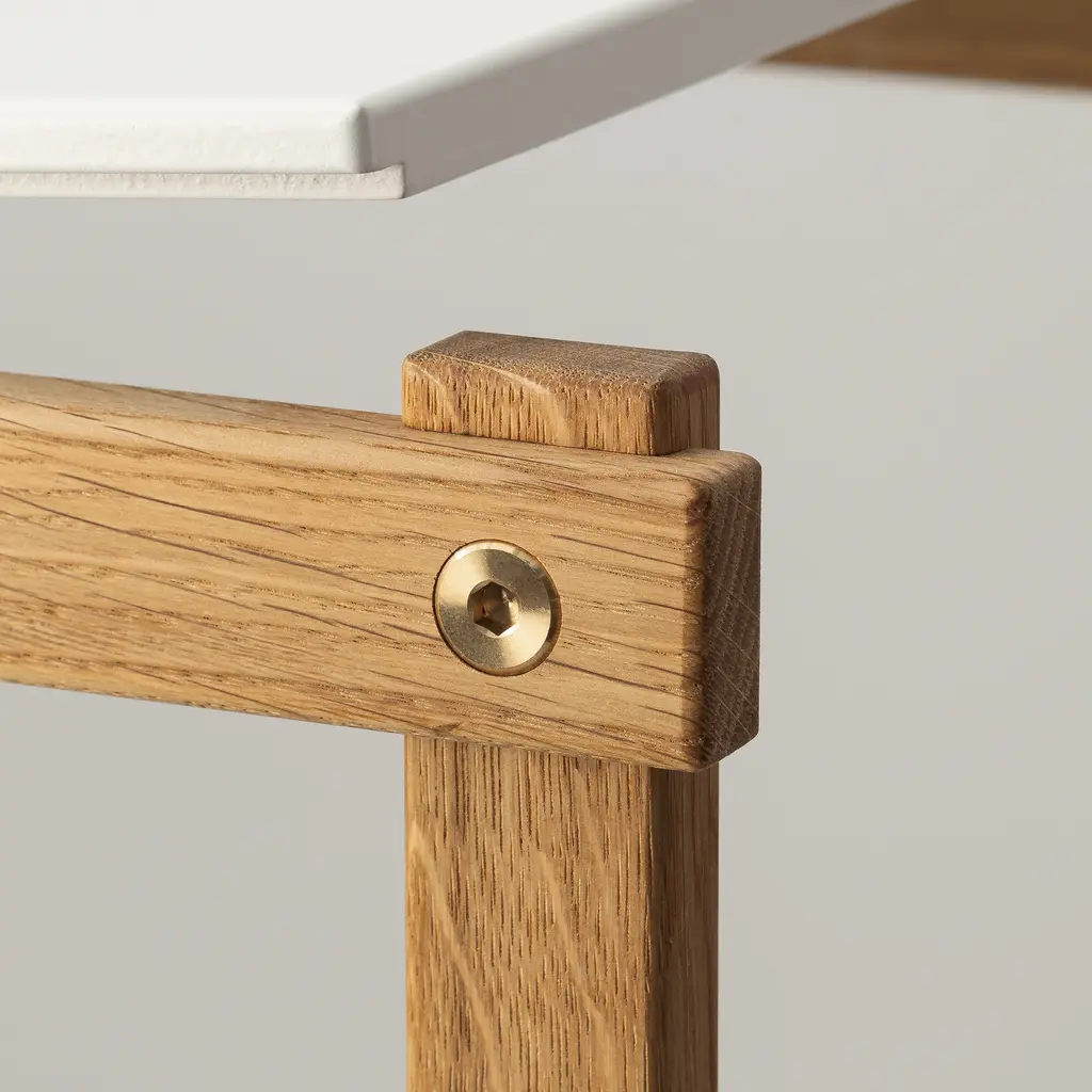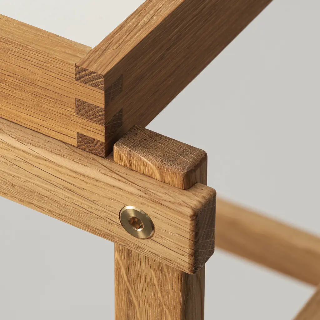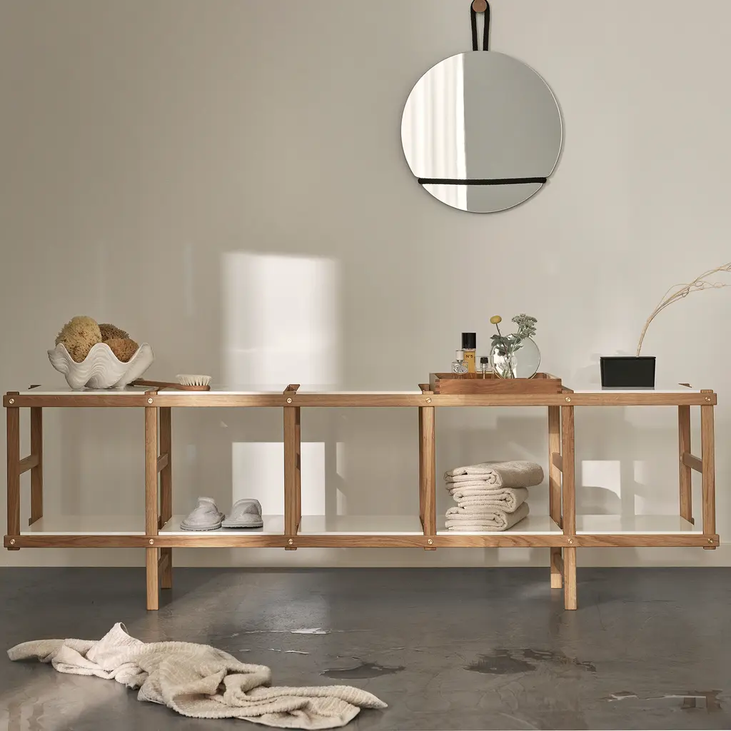 The Frame Low by Harald Hermanrud is a testament to refined design tailored for spacious display without dominating a room’s vertical space. With dimensions of 75.5″W x 22.8″H x 15.4″D and a weight of 40 lbs, it presents a broader horizontal spread suitable for larger items or elongated displays. The photo showcases the unit’s expert craftsmanship: interlocking wooden beams that provide stability, combined with pristine white shelves. The exposed joinery nods to the Scandinavian design aesthetics, emphasizing both function and form. This piece is ideal for those seeking a grounded display platform, perhaps beneath a wall-mounted television or in front of a wide window. The Frame Low seamlessly merges with its surroundings, highlighting displayed items without overwhelming the space. Whether it’s cherished books, decorative vases, or your vinyl collection, this unit serves as a sophisticated stage.