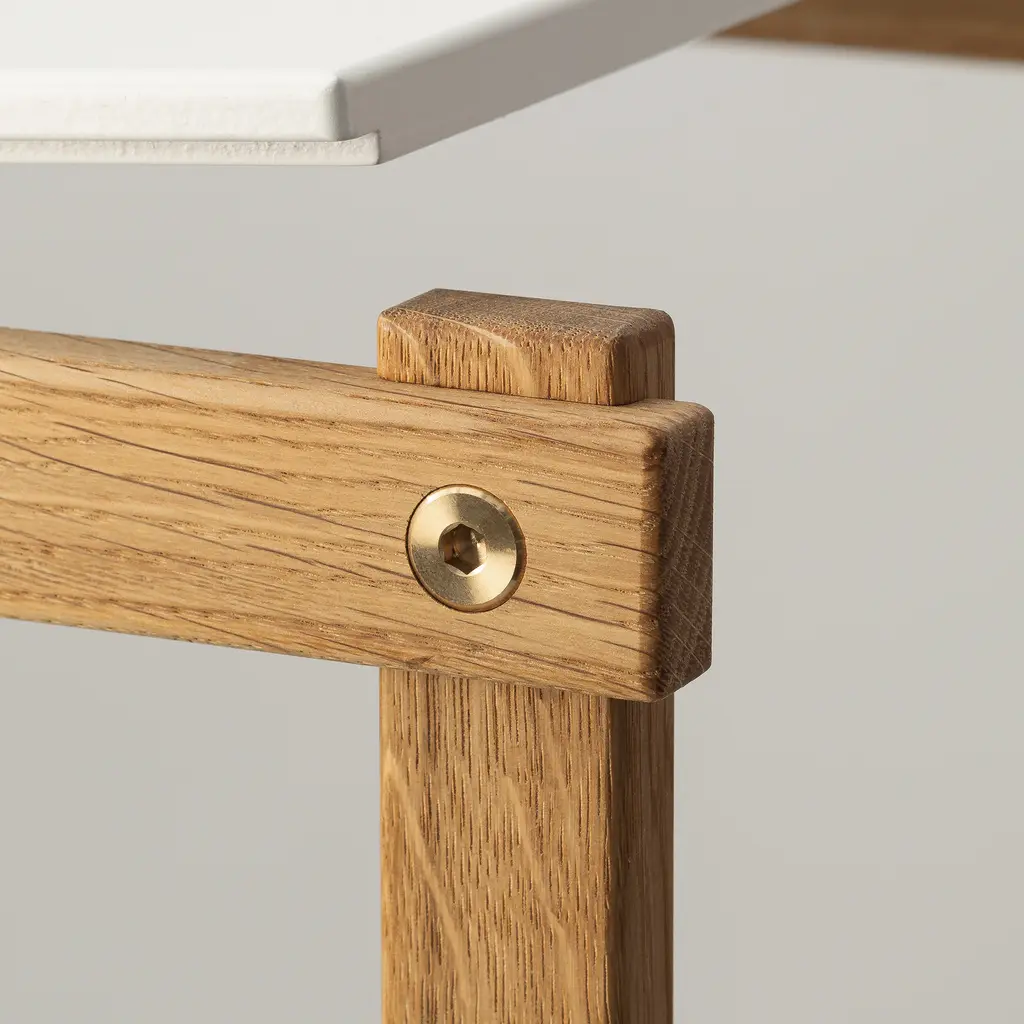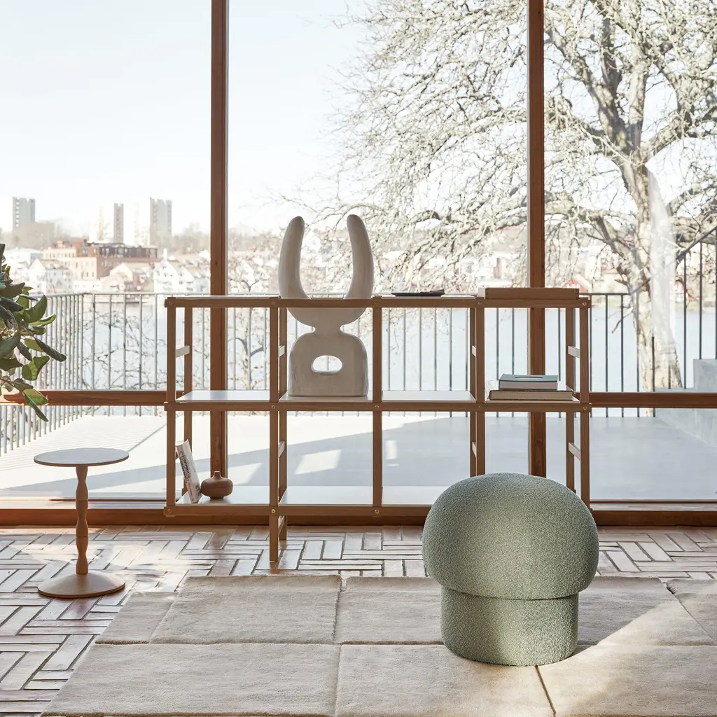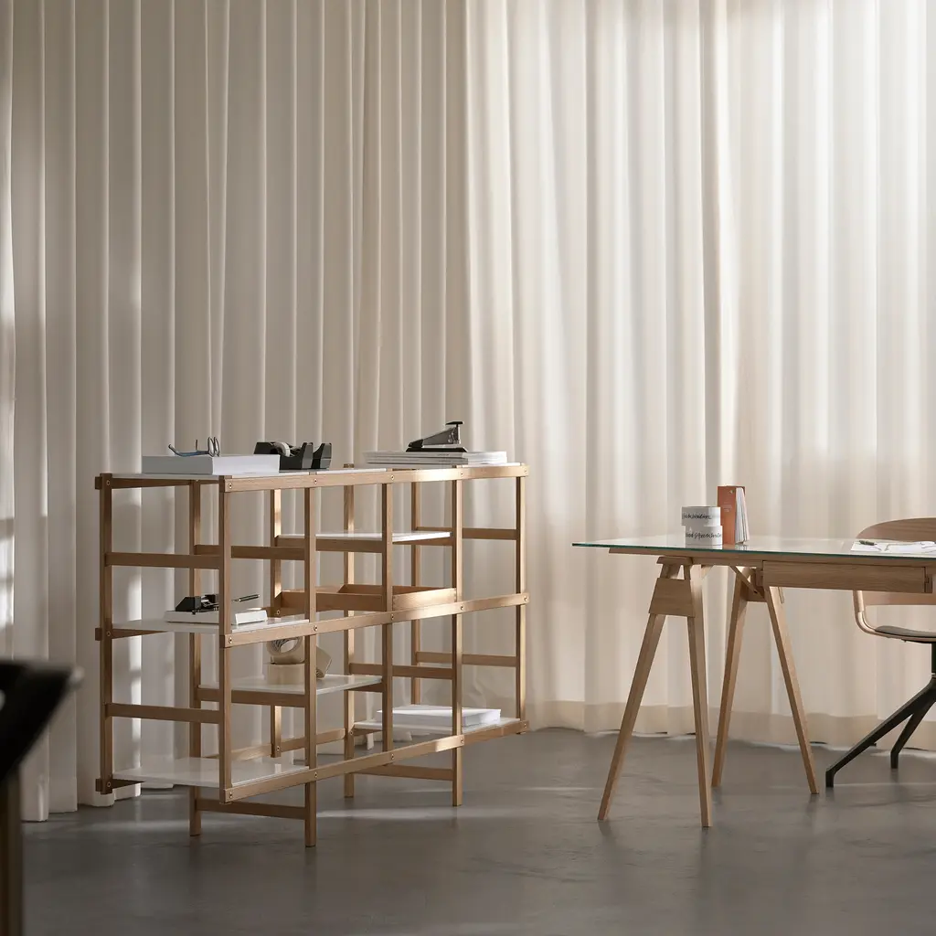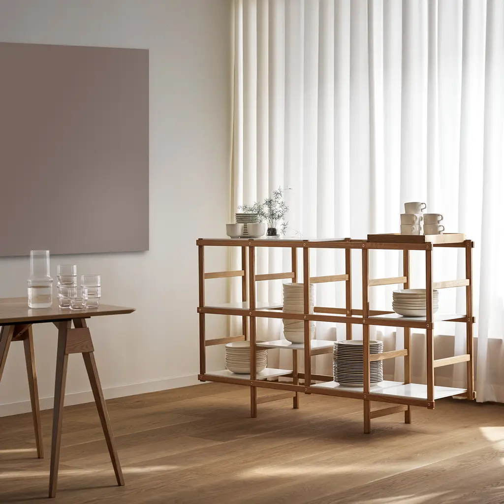 Designed to cater to spaces that require a more compact yet equally impactful storage solution, Frame Medium by Harald Hermanrud offers a versatile and visually appealing shelving system. Measuring 60.6″W x 37.6″H x 15.4″D and weighing 53 lbs, this variation maintains the same design elements of the larger Frame High but in a size that accommodates smaller rooms or specific placement needs. Whether you’re seeking a wall-adjacent unit or a freestanding display, Frame Medium adjusts to your requirements. As with its taller counterpart, the system utilizes a precise grid for holding an array of shelves, trays, and boxes, allowing for tool-free rearrangement. Its construction of interlocking profiled sticks delivers both sturdiness and a lighter feel, adhering to the finest Scandinavian craftsmanship traditions. The design also features exposed solid brass rivet nuts that capture and reflect light, adding an additional layer of transparency to the unit’s construction. Frame Medium is your go-to choice for a shelving system that balances functionality and aesthetics in smaller settings.