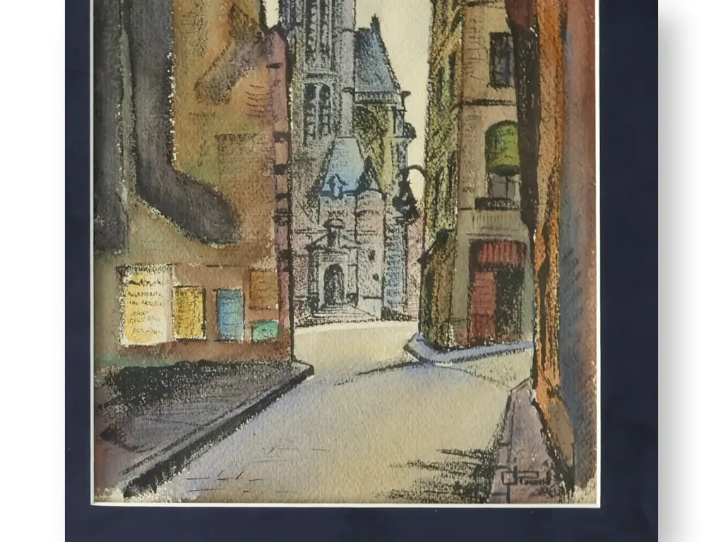 Framed midcentury Parisian watercolor featuring a narrow street leading to an ornate cathedral. Rich, moody tones of terracotta, navy, and ochre highlight the strong architectural lines and shadowed alleyways. The contrast between light and structure captures the quiet drama of an early morning in the city. Signed lower right, double matted in deep navy, and presented in a carved giltwood frame.