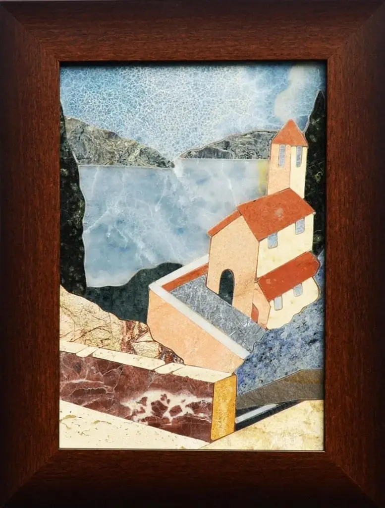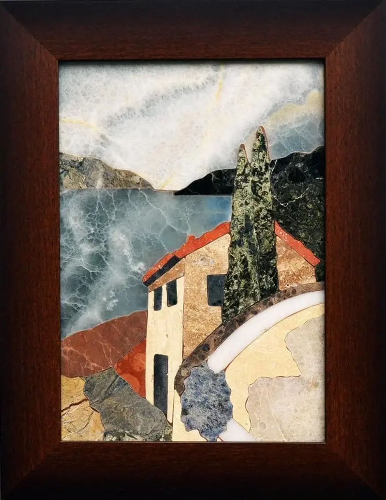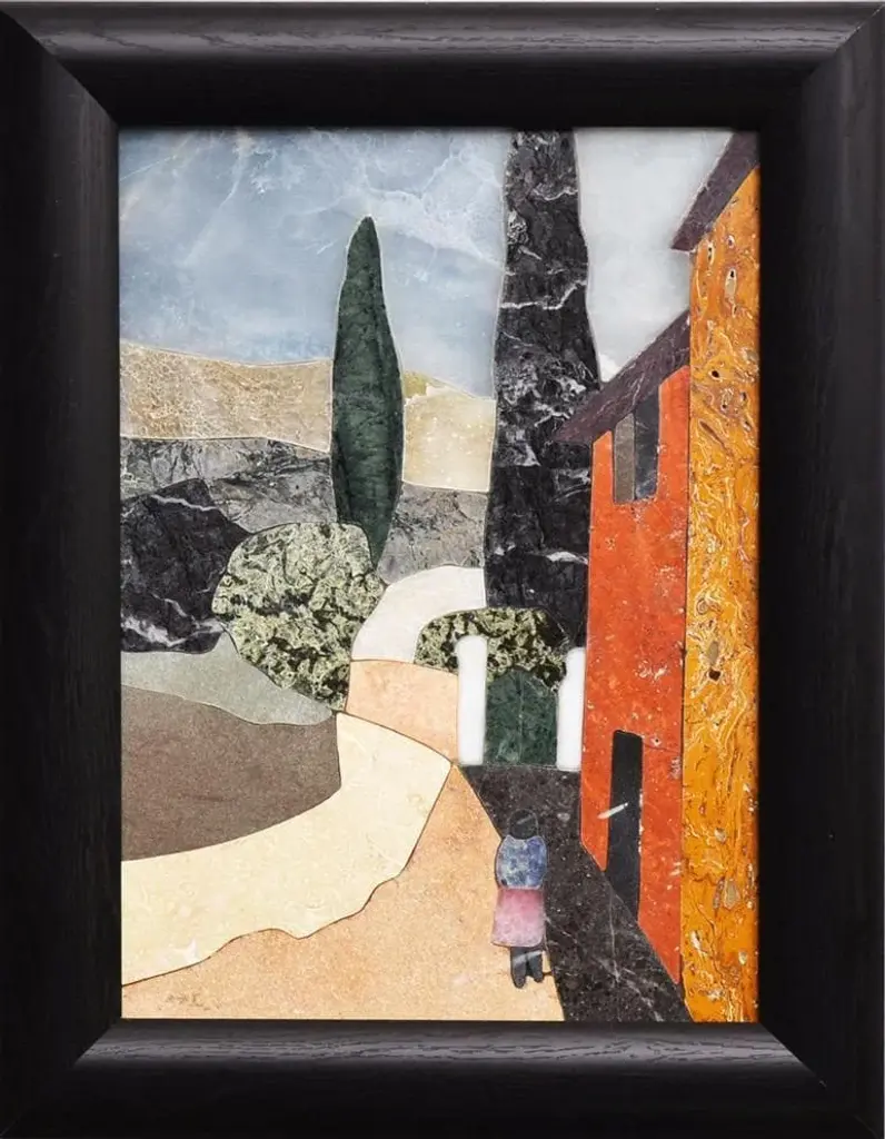 This is an authentic handmade Pietra Dura mosaic.A natural scene village in the mountains trees alongside and the sky above.This item is composed of all natural Semi-Precious Stones . Using the sec-tile technique natural stones are cut into different patterns and shapes to fit the component parts of the given design. This piece is framed with natural wood of a black color that can be customized to suit your furniture color.