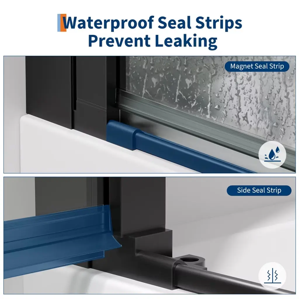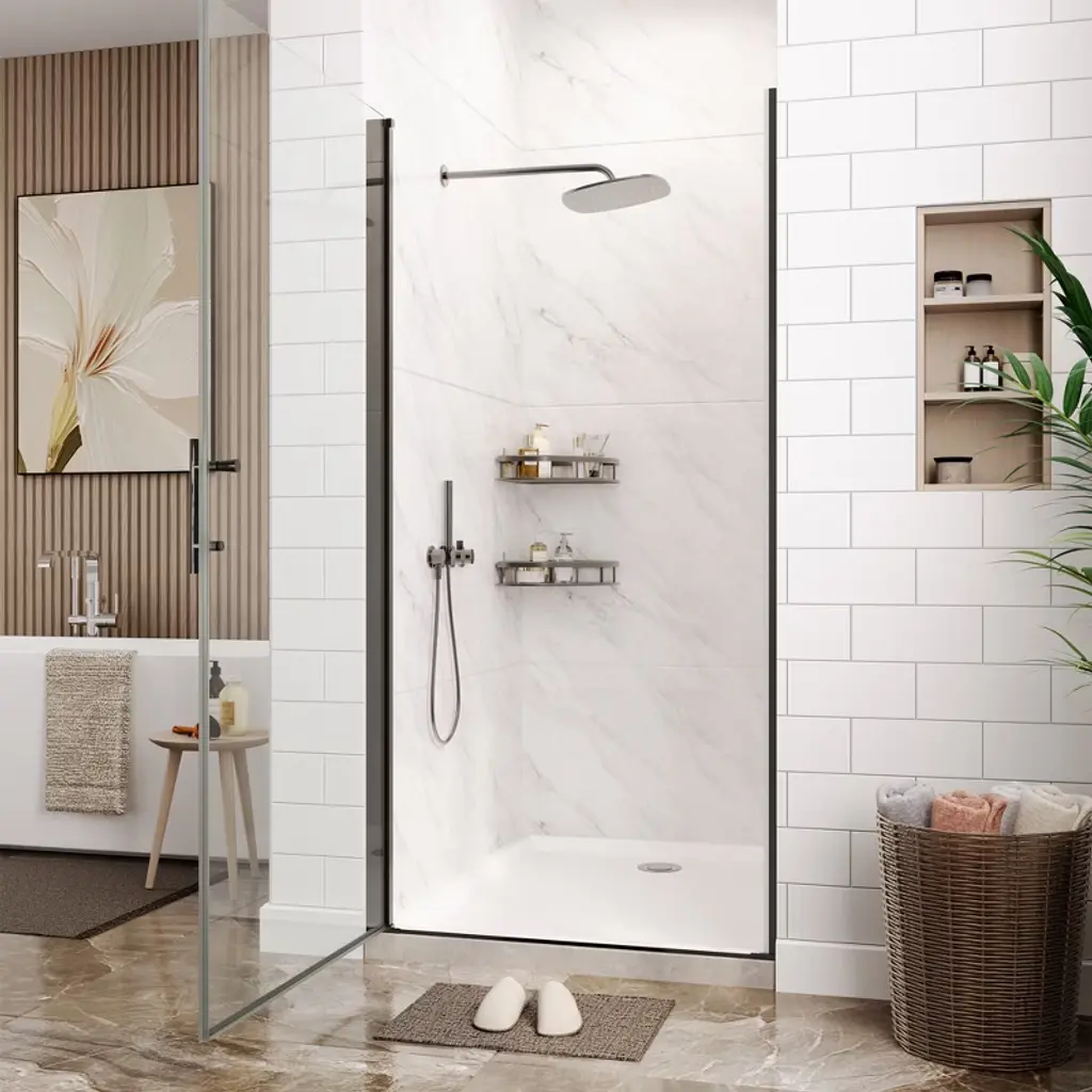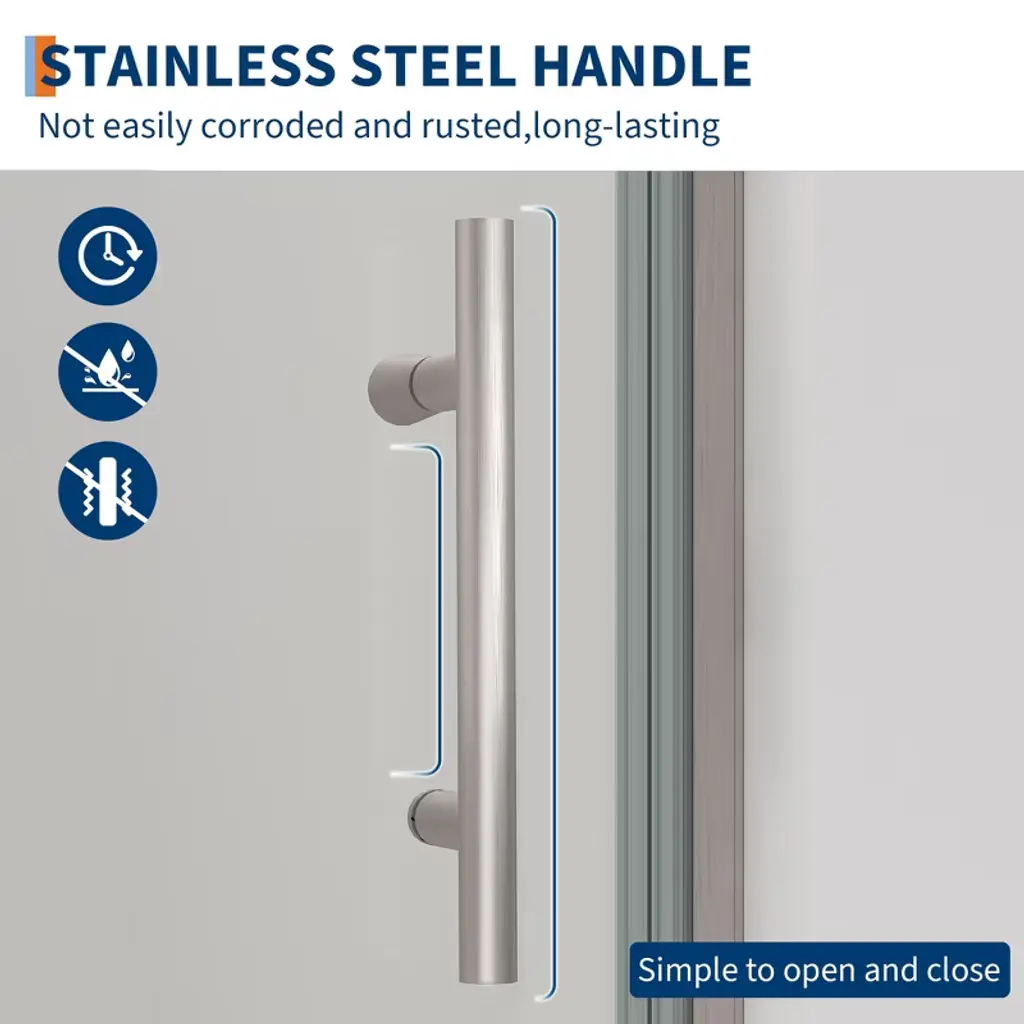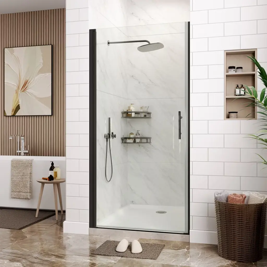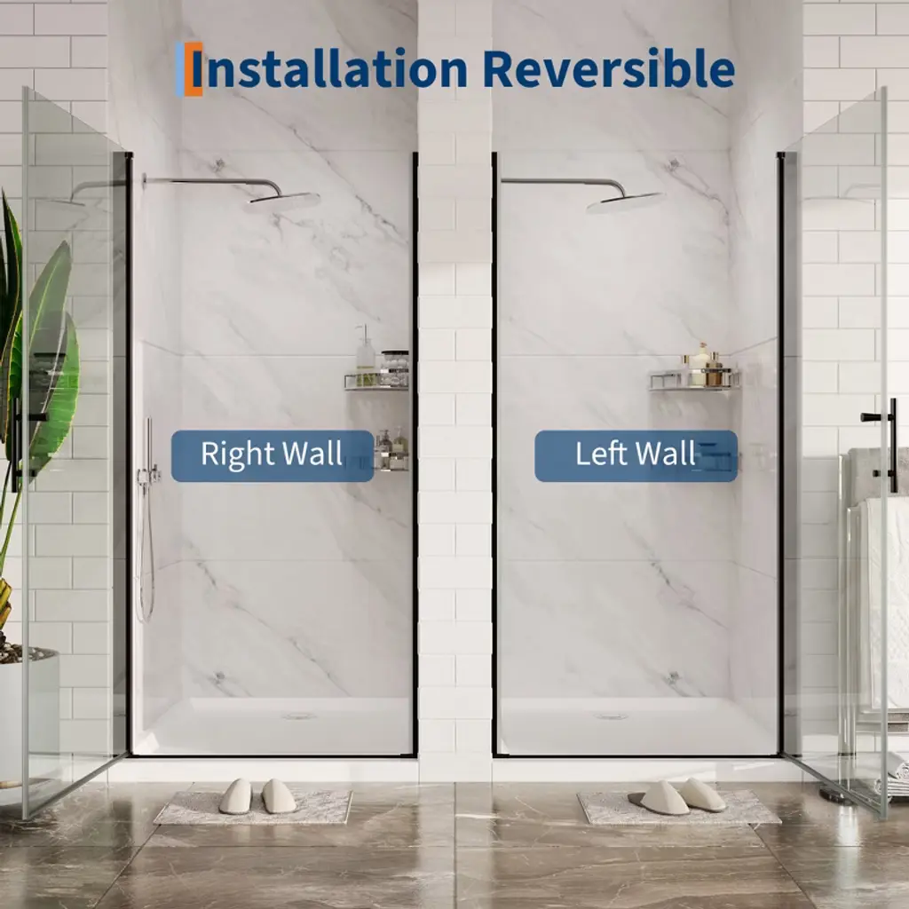 Pivot Swing Shower Door:The pivot shower door has exquisite craftsmanship and modern simplicity.It combines safety, durability, waterproofing, flexible installation, delicate packaging and a timely after-salesIts pivot with a 180° overlapping rotation angle saves space and is convenient.It's a great choice for enhancing bathroom style and quality.、Combined with tempered glass and aluminum structure, is elegant and durable.The unique handle can hang towels, meeting daily needs with its considerate design.The well-designed waterproof strip precisely divides the wet and dry areas.Preventing the spread of water stains, enjoy a well-ordered spatial experience.Package IncludedShower Room Glass Door ×1 Installation Manual ×1 Aluminum Alloy Single Rotating Frame ×1 Aluminum Alloy Bottom Fixed Frame ×1 Aluminum Alloy Right-Side Frame ×1 Water Barrier Strip ×1