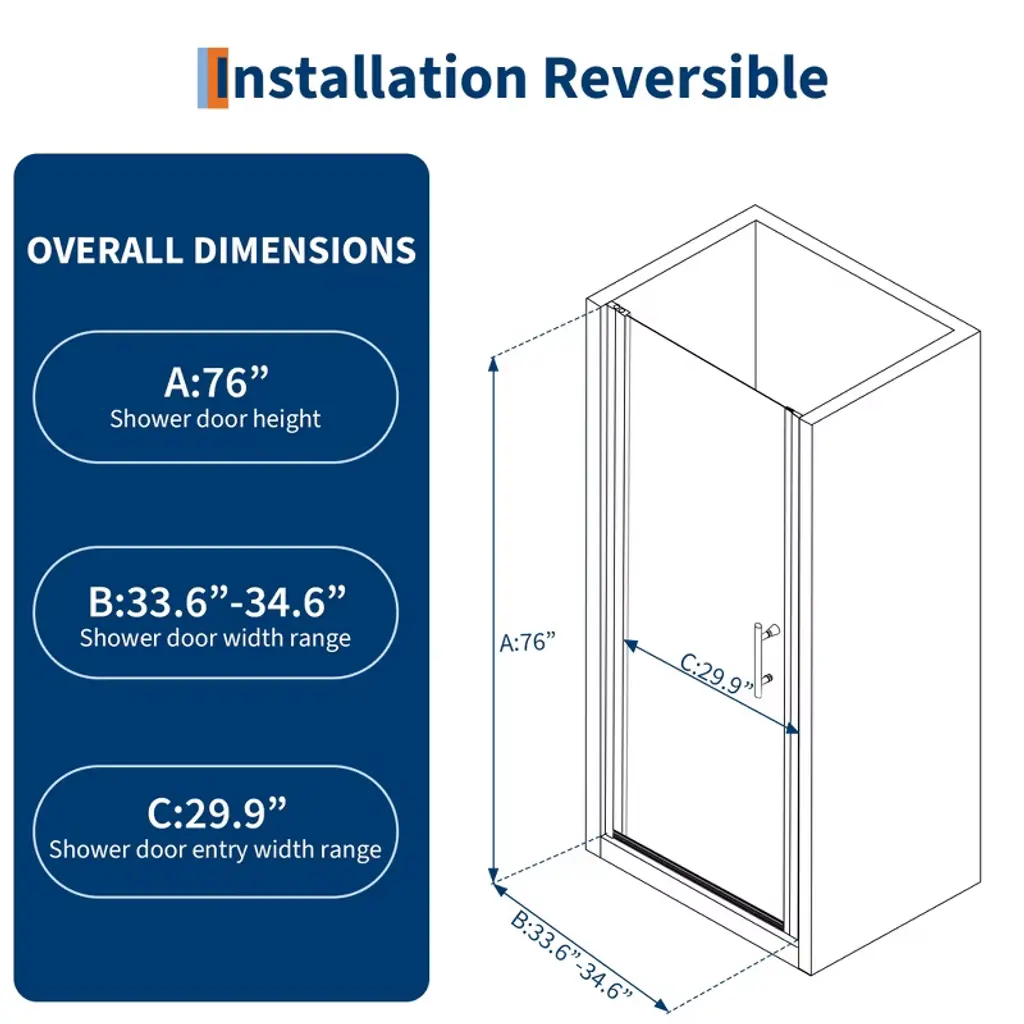 Frameless Pivot Shower Door 72" X 33.6-34.6" , Pivot Swing Shower Glass Door With 1/4"(6mm) Clear Tempered Glass Shower Door, Matte Black