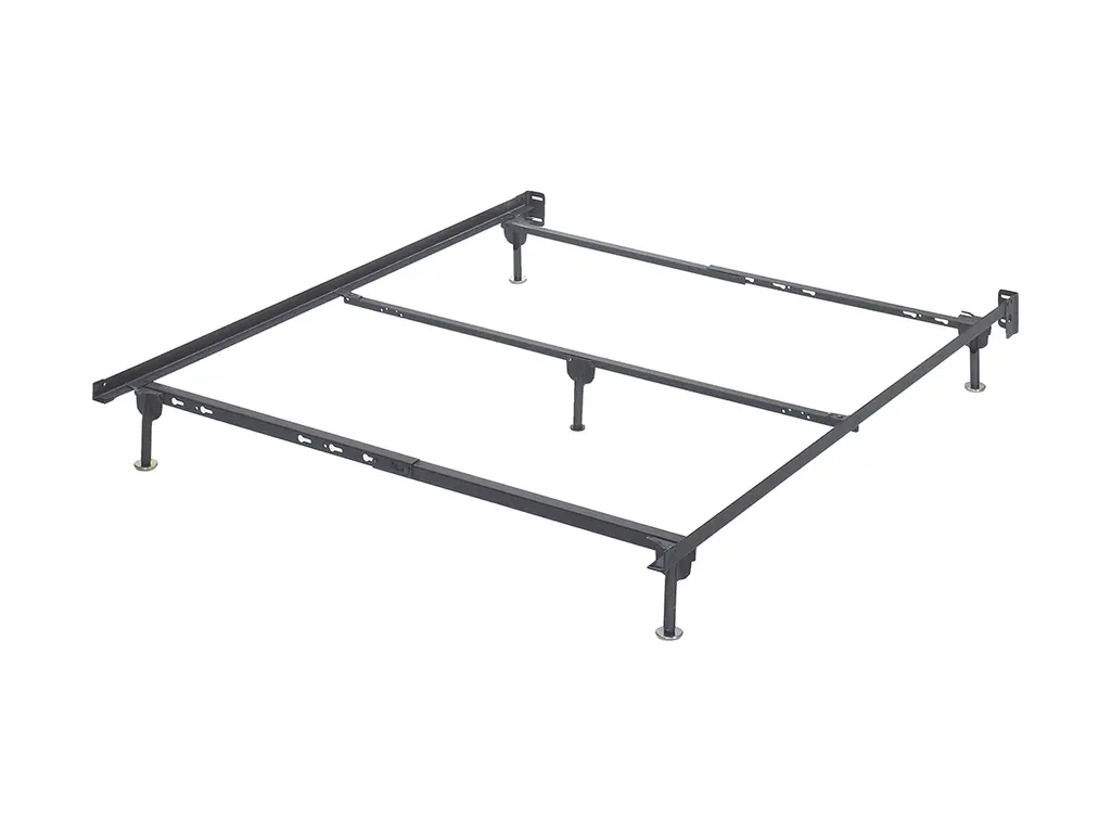 Sturdy metal bed frame supports queen mattresses and box springs. Bolts connect frame to most headboards.