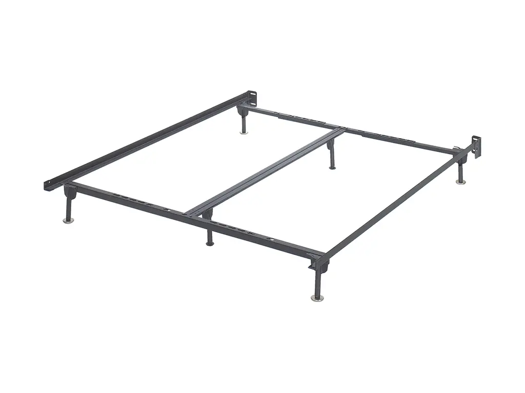 This sturdy metal bed frame supports queen/king/California king mattresses and box springs. Bolts connect the frame to most queen/king/California king headboards.