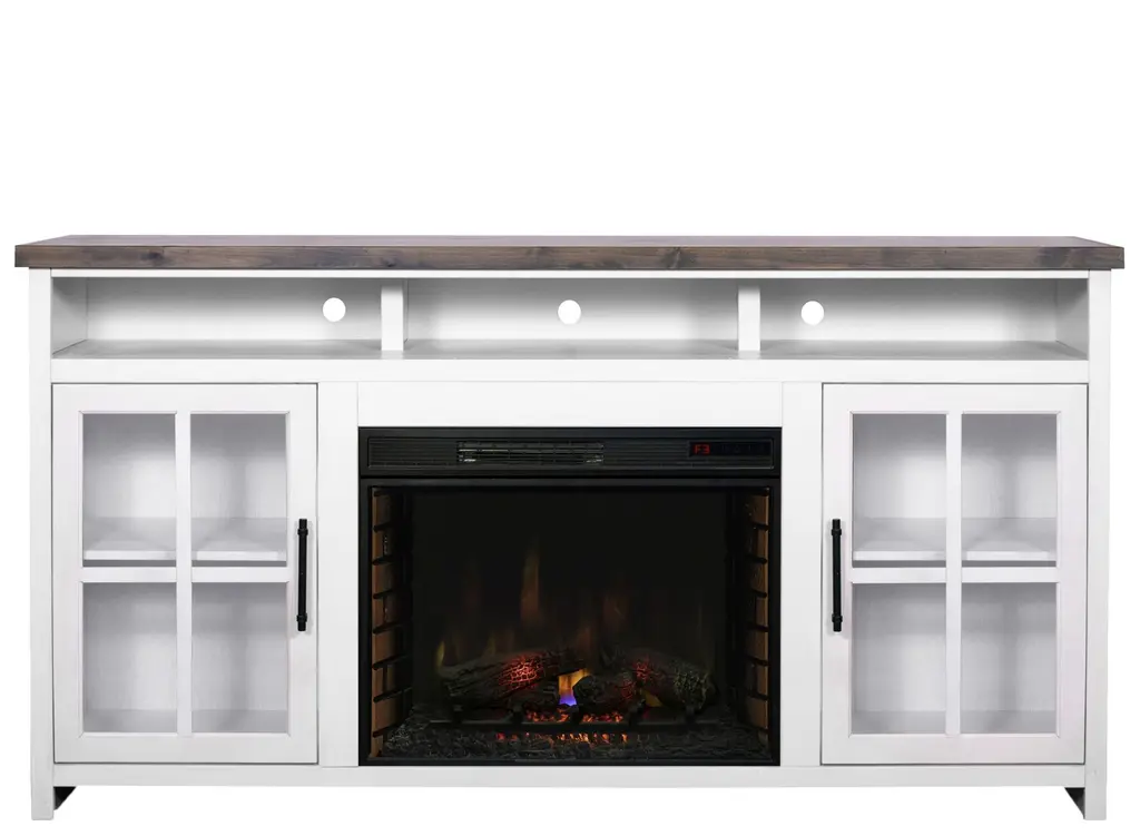 Your Frampt 74" Fireplace Console has an easy going styling of coastal and cottage, blended with a rustic finish to create this unique looking piece. Holds up to an 85" TV with plenty of room to store your media gear and to show off your personal touch. The house warming 28" fireplace insert has clear crystals and traditional log set with embers to keep you toasty while binge watching your favorite TV show or movie.