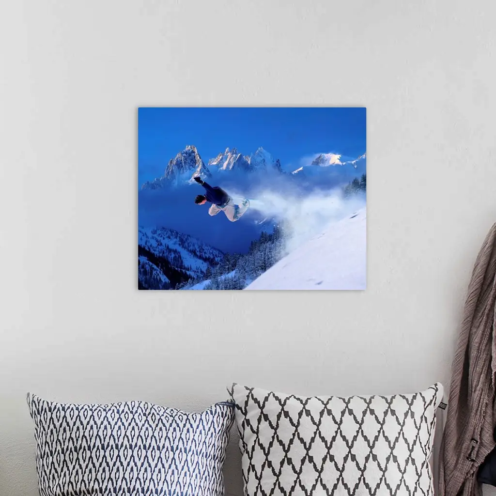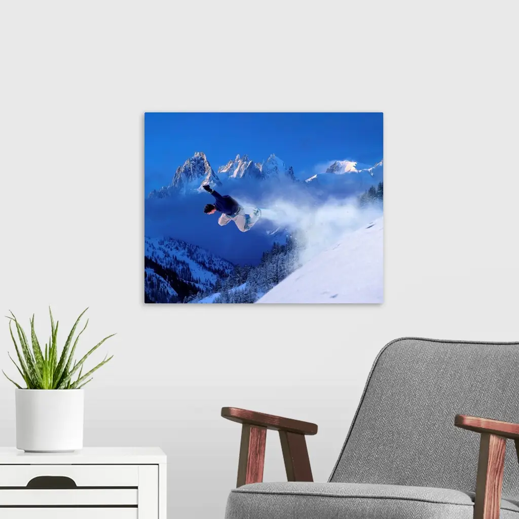 France, Chamonix, snowboard, Snowboard, Aig. Le Verte in background wall art for home and office decor. Discover canvas art prints, photos, mural, big canvas art and framed wall art in GreatBigCanvas.com's varied collections.