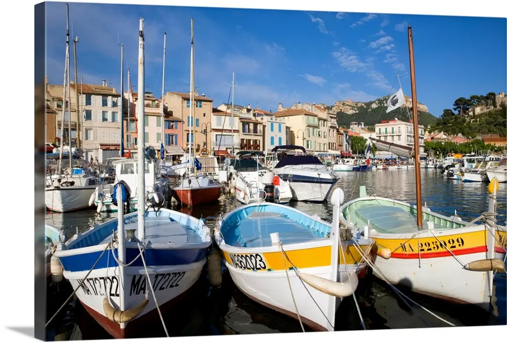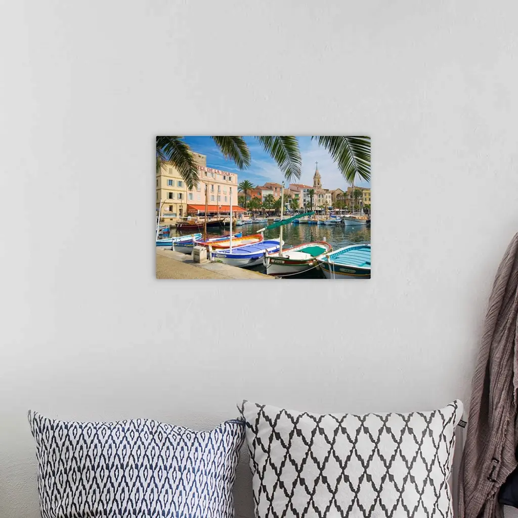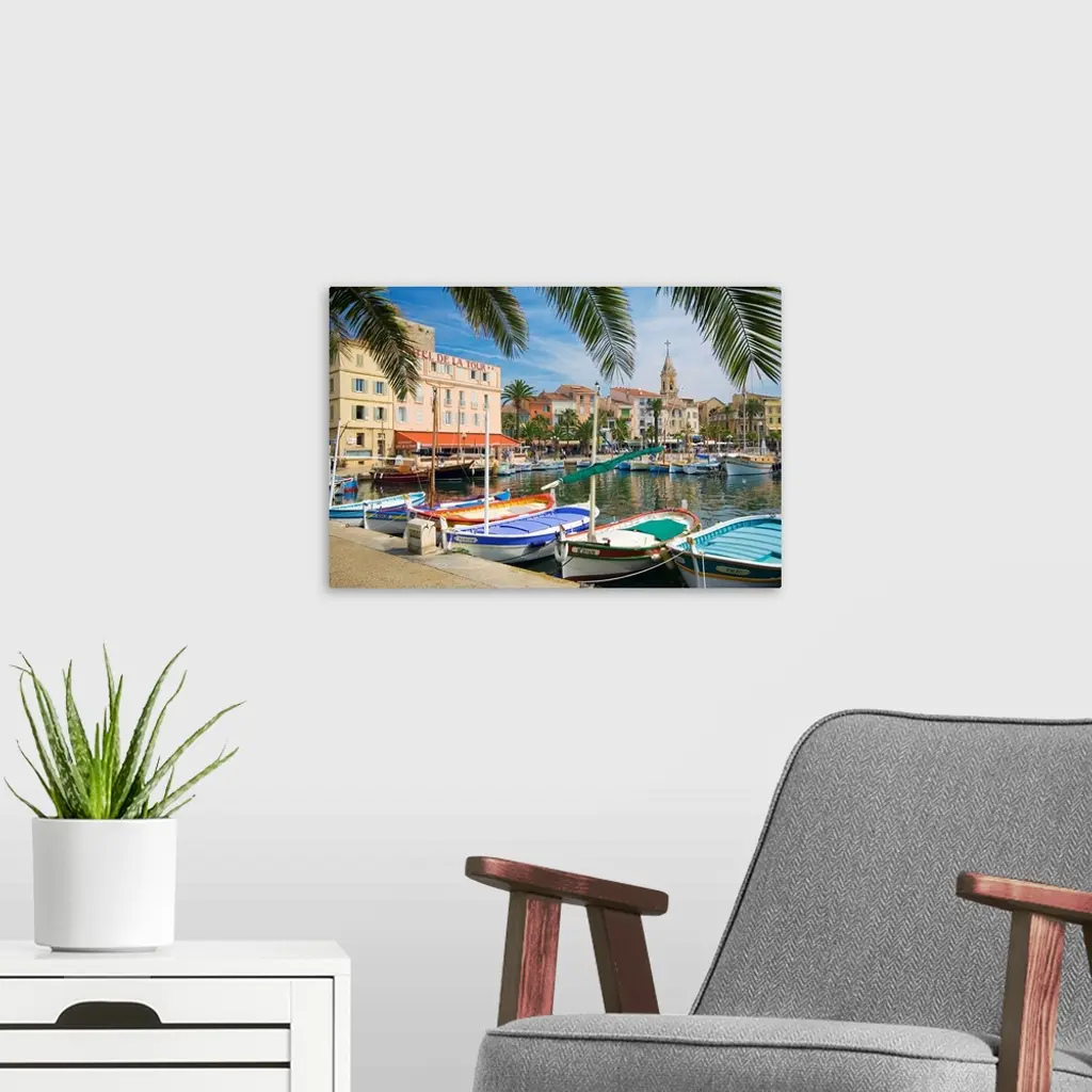 France, Provence-Alpes-Cote d'Azur, Sanary-sur-Mer, View of the harbor wall art for home and office decor. Discover canvas art prints, photos, mural, big canvas art and framed wall art in GreatBigCanvas.com's varied collections.