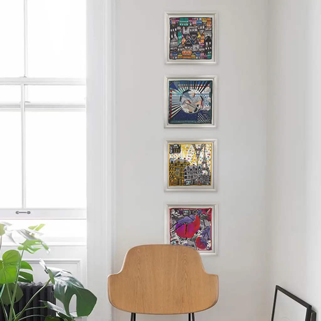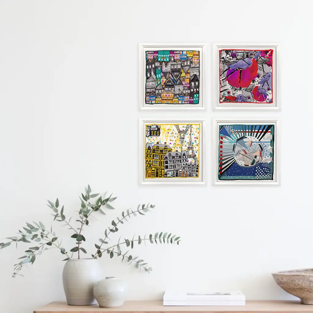Set of four frames.Inspired by France; St. Tropez, Paris, Alsace, Moulin Rouge Paris.All of our products are illustrated by hand and purposefully designed to inspire feelings of wanderlust.The paintings consist of special designs drawn by painters with a passion for art and travel.Color your Home with Art with Un Poco!· Our patterns are hand drawn and digitally printed.· 100% silk scarf with 100% wooden frame.· The edges of our scarves are sewn by hand.