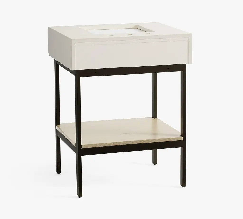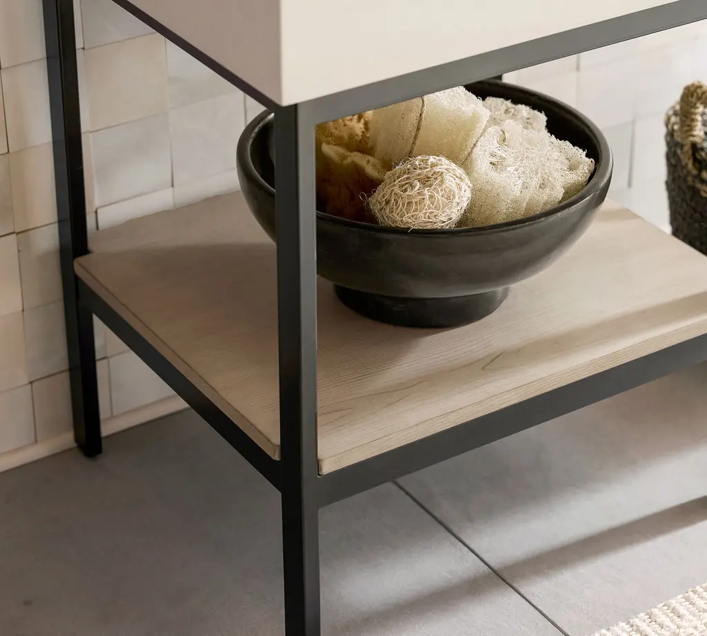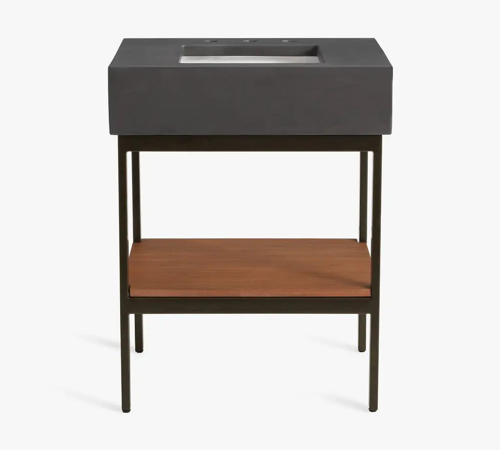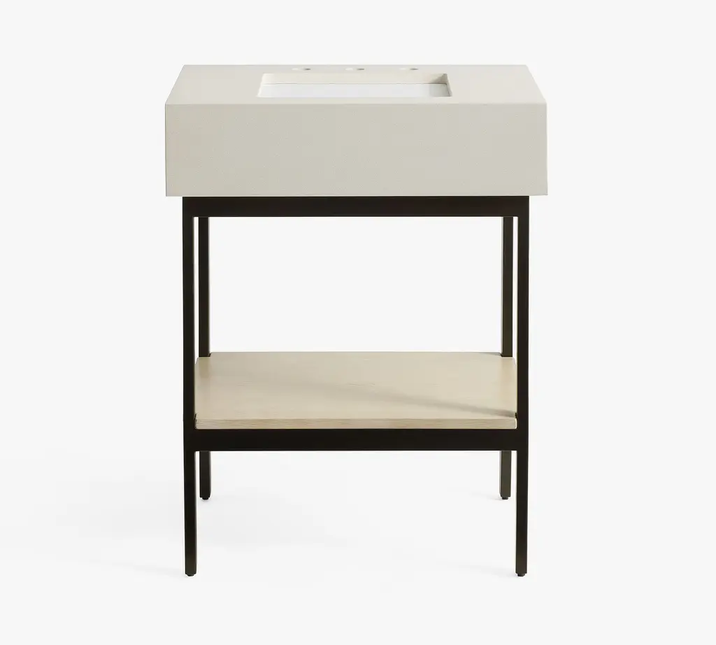 For a perfectly modern look, this pared-down collection is defined by its simple lines and sleek style. Give your bath an instant upgrade with its thick quartz top, wooden shelf, and open, easy-access base.