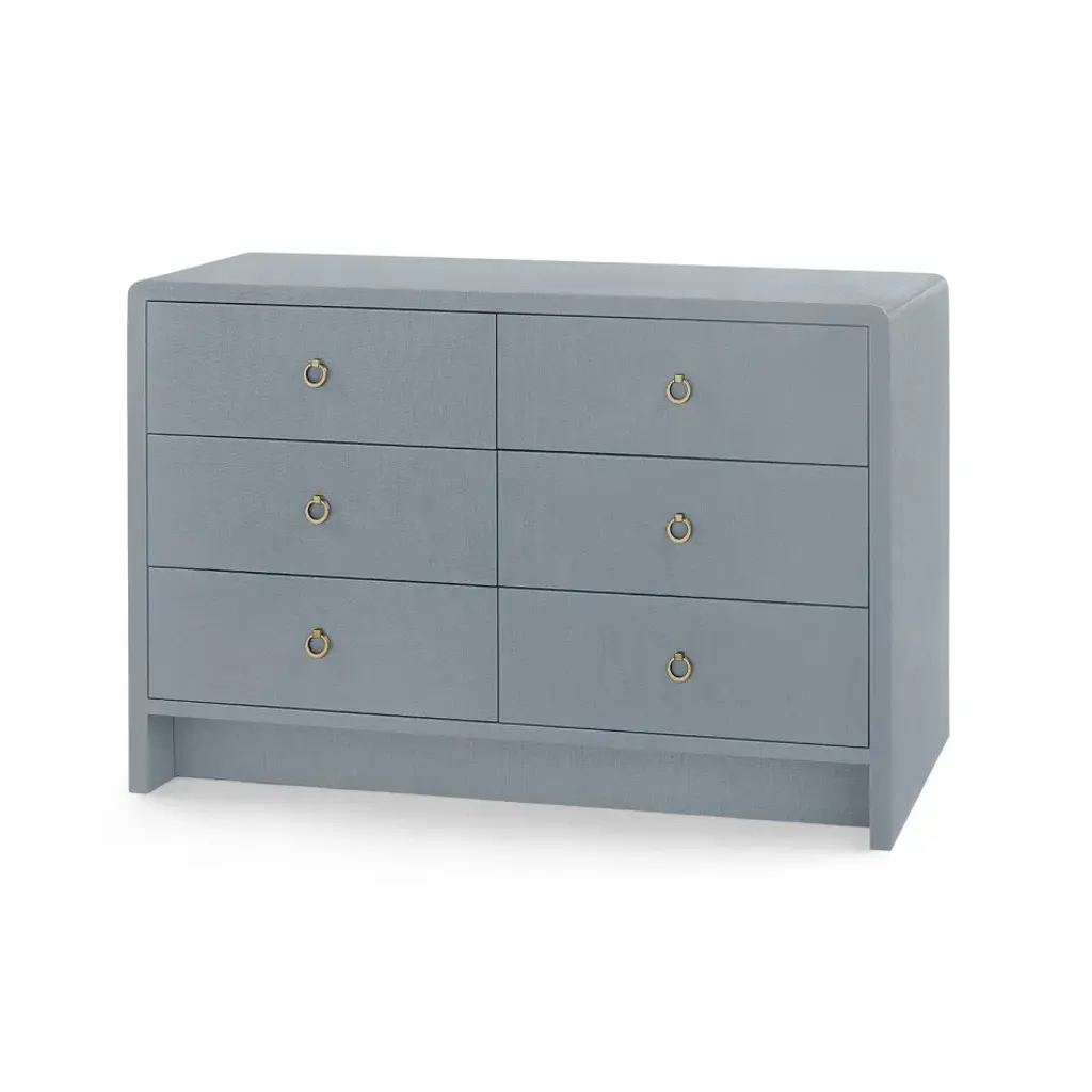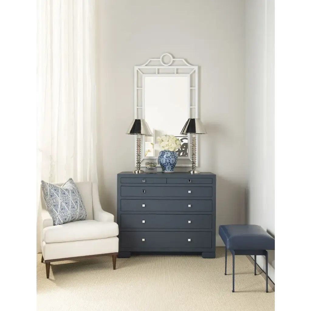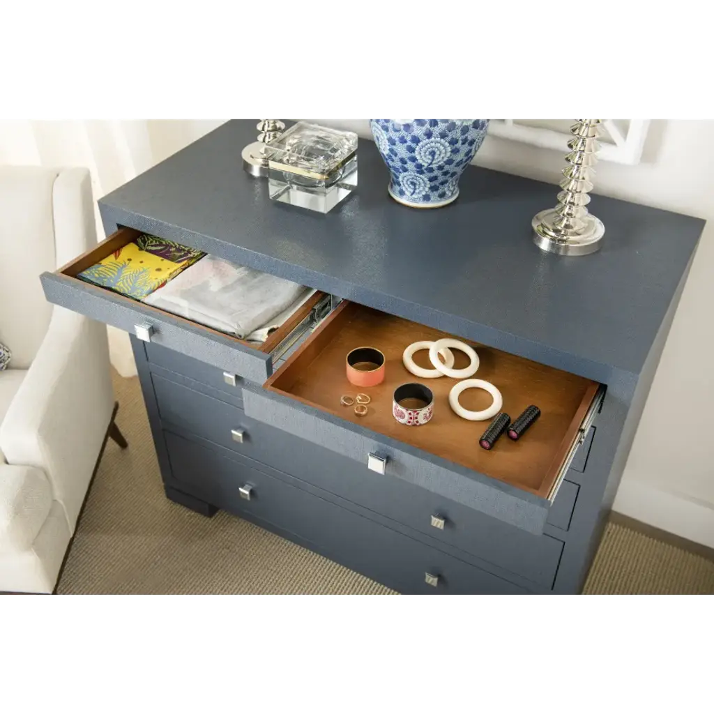 The Frances Collection presents perfectly tailored pieces which make the most of the luxurious finishes Villa & House is known for. Expertly swathed in lacquered grasscloth, the Frances 6-Drawer provides a unique contrast between its tactile materials and structured form. Clean lines mark the graduated proportions of its six-drawer facade, leaving a striking visual impact. At the top, two thinner drawers rest side by side (ideal for storing delicate trinkets or jewelry), followed by a stack of deeper drawers which grow proportionally larger towards its base. Each set on soft-closing glides, they boast rich stained wood interiors and chrome finished square pulls. In sophisticated navy blue, the Frances makes for a sleek storage solution in any space.