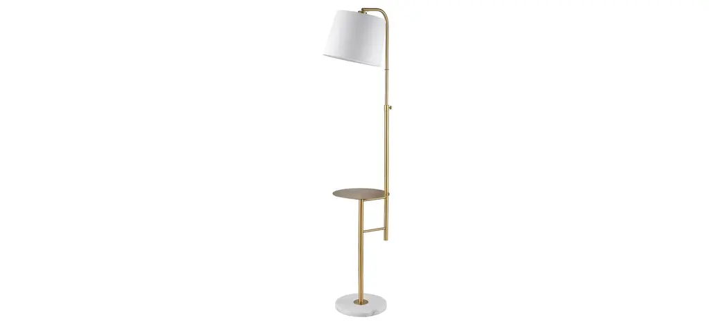 Franco is a nod to the founder Franco Scalamandre. The hunting arrows of the "Le Zebre" print inspired the floor lamp from the iconic wallpaper pattern. The floor lamp features a 14" diameter glass tray top, perfect for placing a cocktail or cell phone. It includes an aged brass metal cylinder finial and requires minor assembly. The lamp has a 3-way switch and supports a 150 watt max bulb. It comes with a round hardback drum shade with a soft rolled edge, lined with gold foil. The measurements are 60"H x 18"Diameter, and it is crafted from materials including brass, granite, and glass.