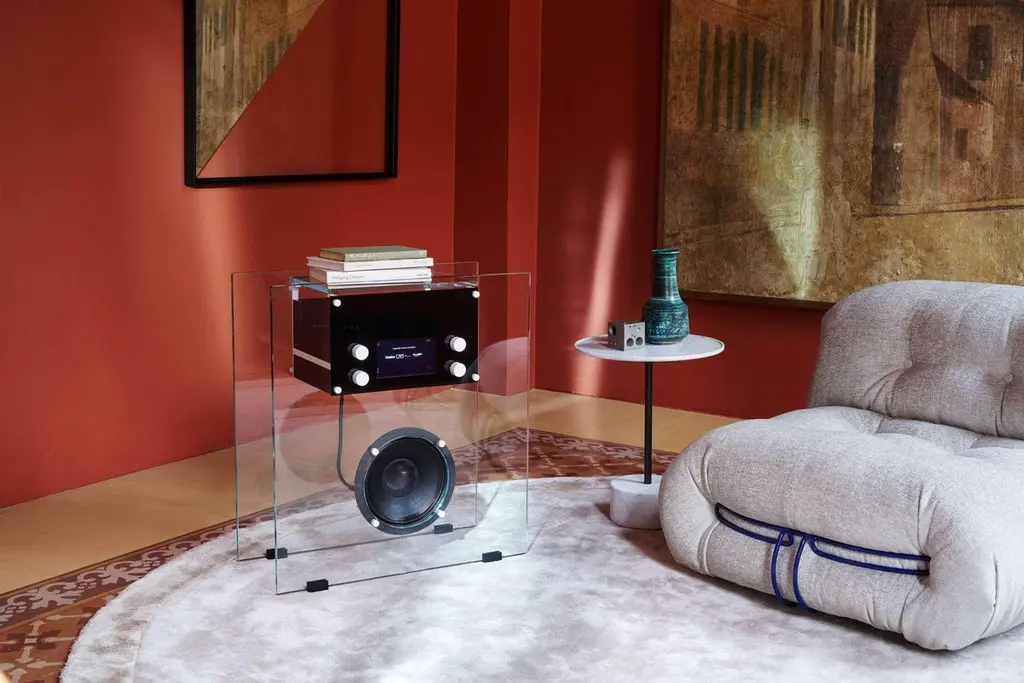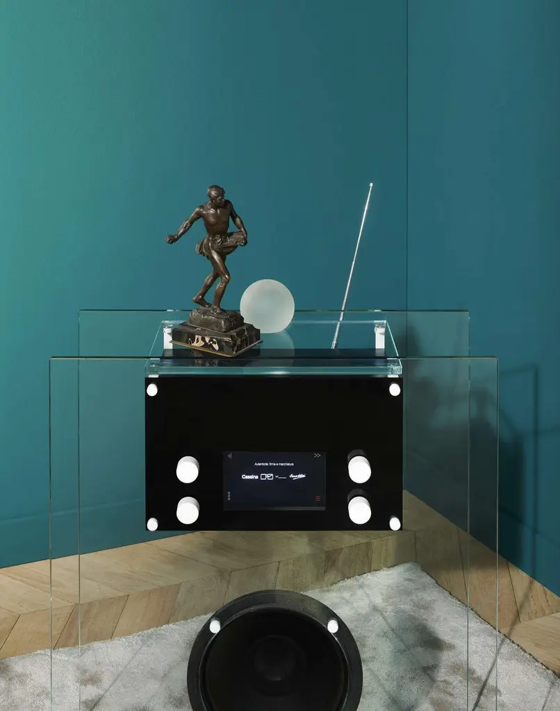 please note: 842 subwoofer wireless for clearglass-radio is currently not available. Radio is available separately though. Prices vary dependent on the material/color/model of the product.Radio in Cristallo station by Franco Albini in 1938. Relaunched in 2021. Manufactured by Cassina in Italy. Radio in Cristallo goes straight to the heart of the project that Franco Albini created as a prototype-model in 1938 for his home. He took apart and reassembled a radio in a wood cabinet received as a wedding gift, exposing the electric components by pressing them between two sheets of tempered glass. A tribute to lightness, a step that catapults the designer in the direction of bold modernity that, by demonstrating progress, narrates its value. In concert with Fondazione Franco Albini, Cassina has optimized the design the architect entered into a competition by the Swiss company Wohnbedarf in 1940, keeping the same size while adding new Bluetooth technology and an optional subwoofer that, connected to Wi-Fi, creates a more enveloping atmosphere. Radio in Cristallo will also be offered in a special limited edition of only five pieces. The Radio in Cristallo L.E., with a numbered metal plate on the side of the structure, will feature white knobs and an electronic circuit board with all hand-soldered circuits.