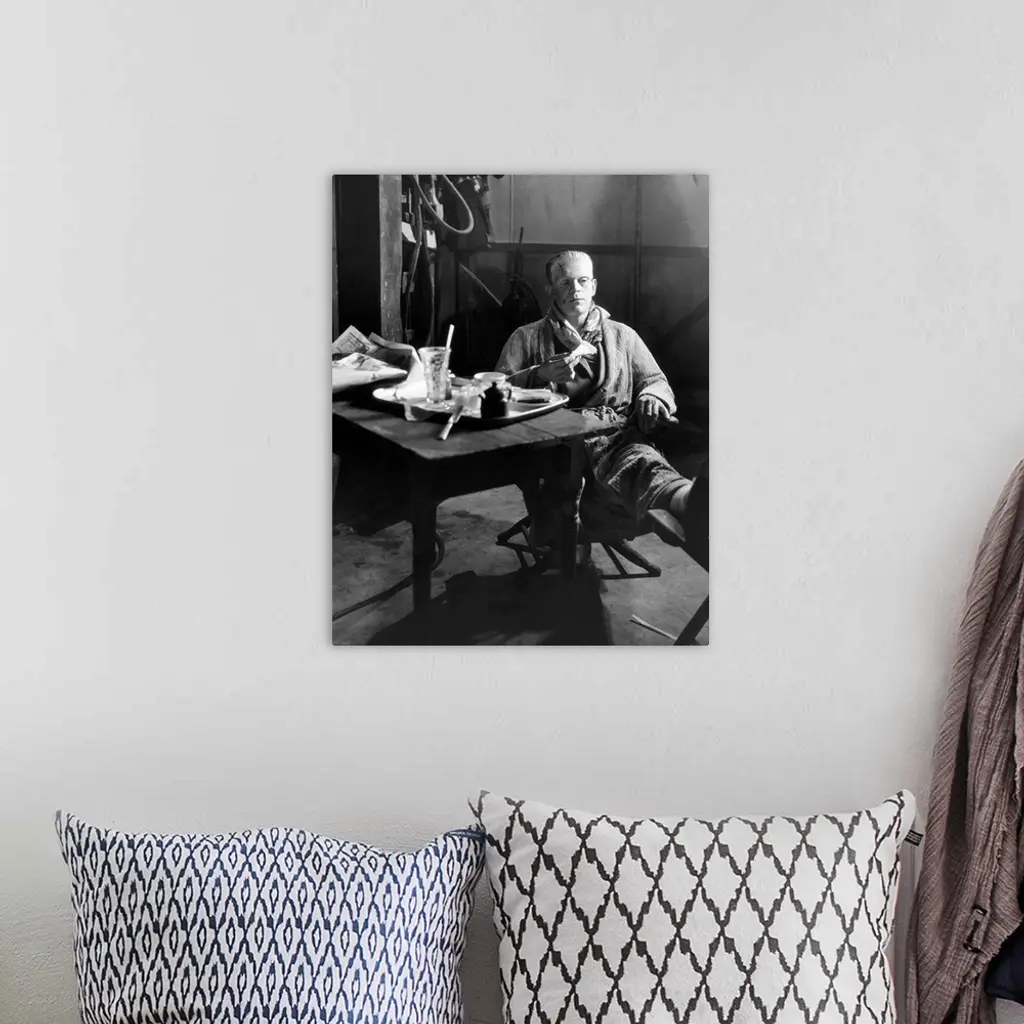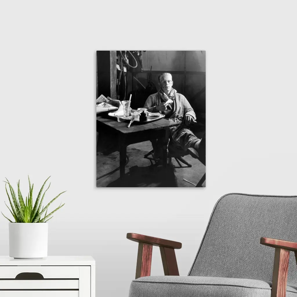 Boris Karloff still in makeup as the Monster, having lunch on the stage set of 'Frankenstein', 1931.