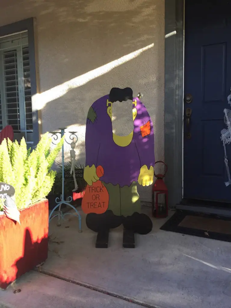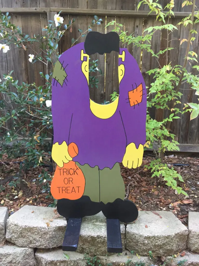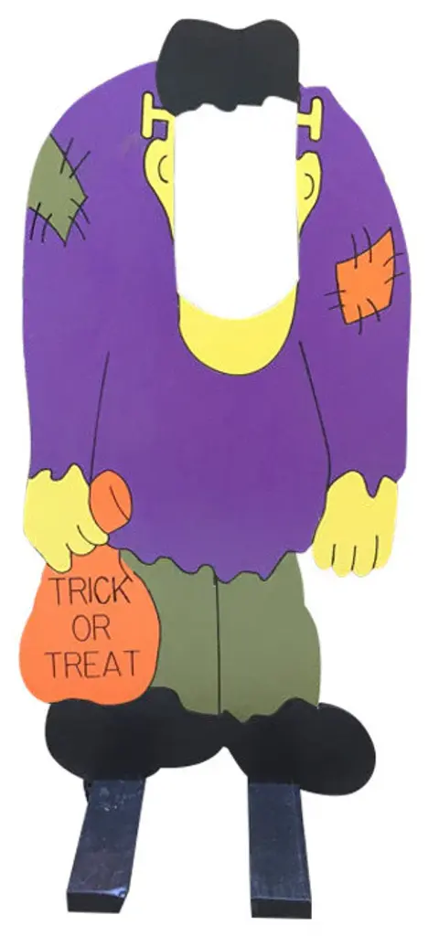 Our Frankenstein photo-op character stands 4 feet tall by 24 inches wide. Cut and engraved from 1/2 inch wood... this guy will stand the test of time.I hand paint each sign with 3 coats of exterior paint and seal all sides for protection. The back of the sign is painted black.Use this sign for photos or for a bean bag toss game and your sure to delight the crowd. The sign does not include a stand.