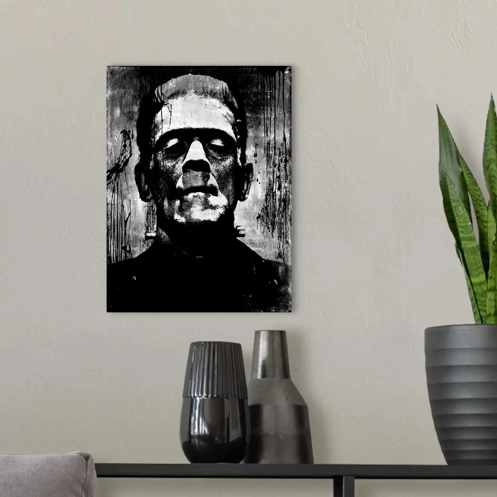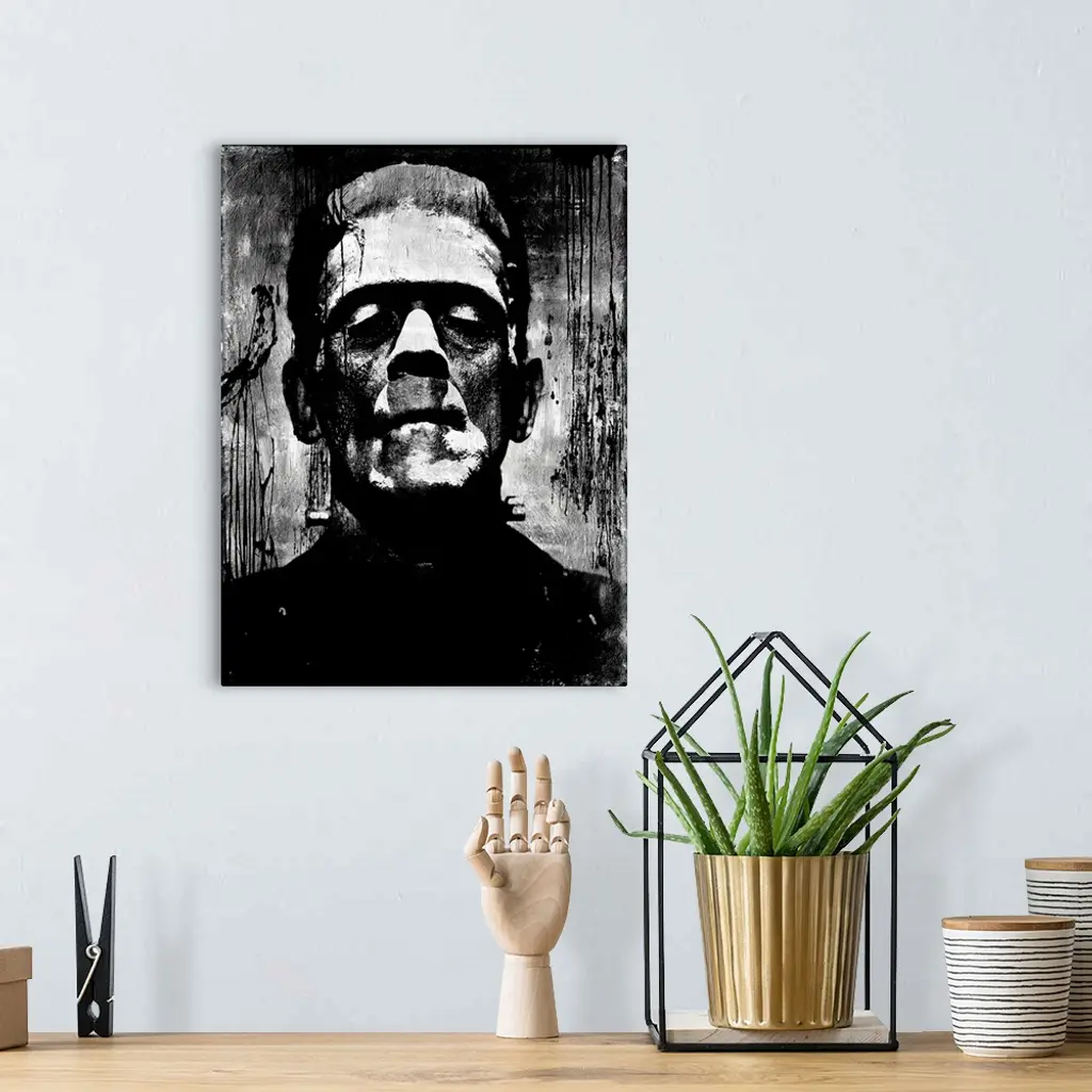 Portrait of Frankenstein in black and white.