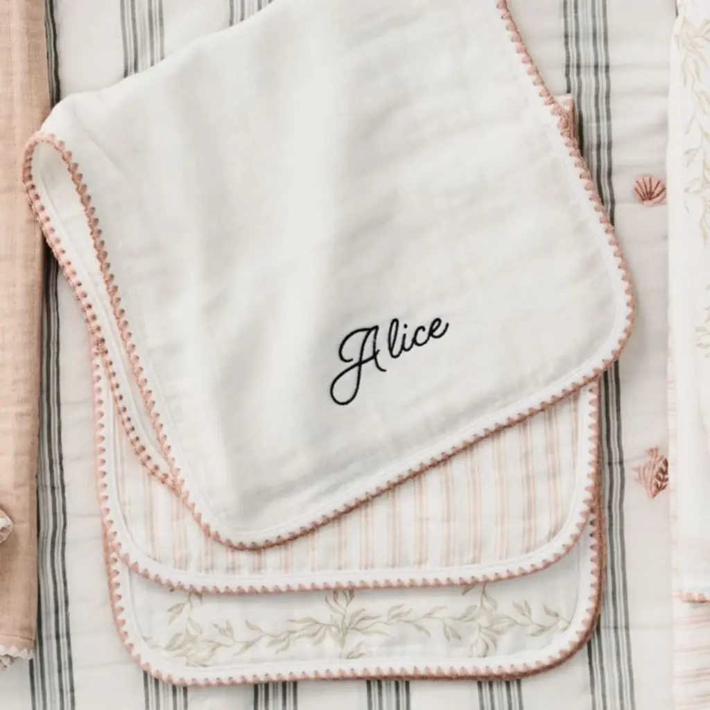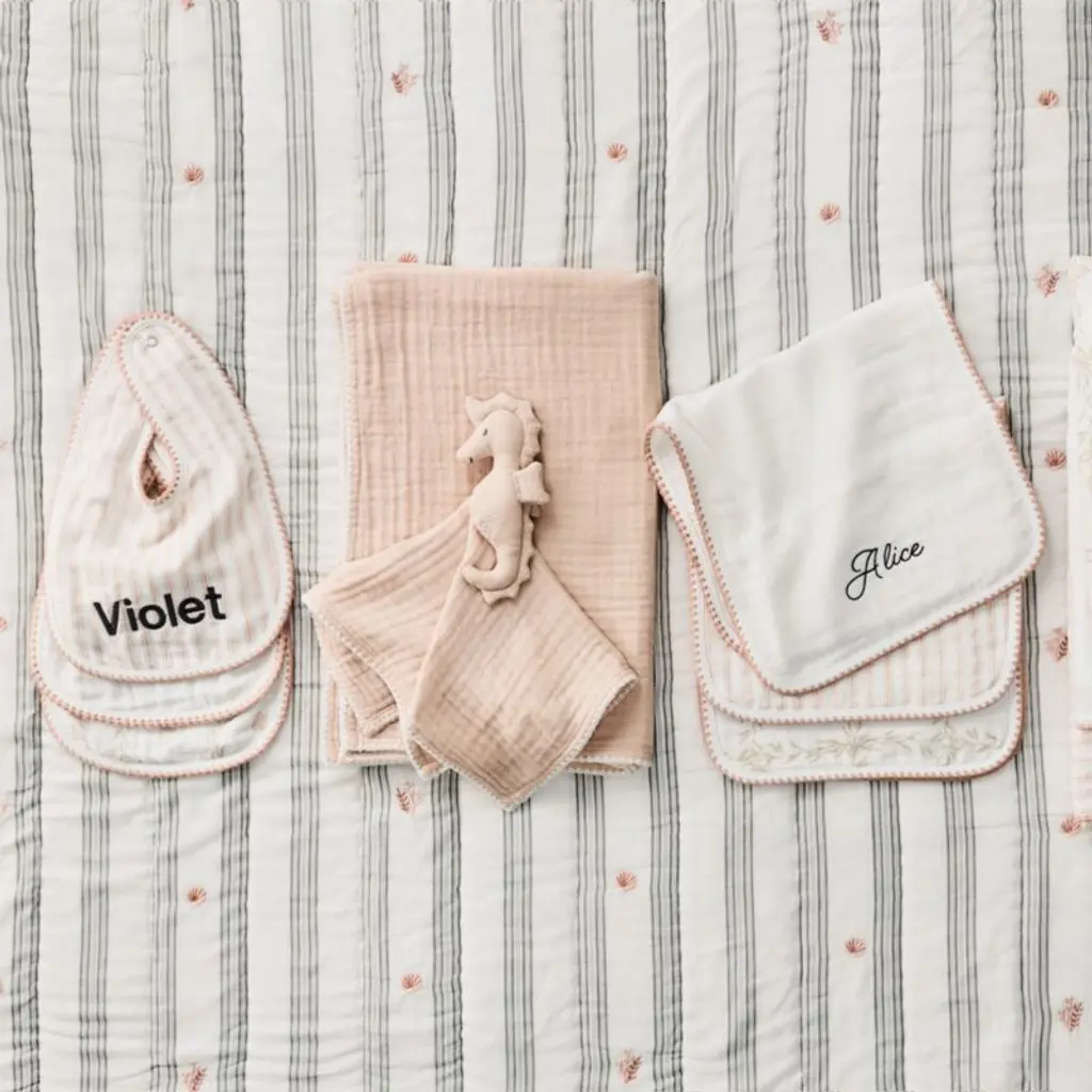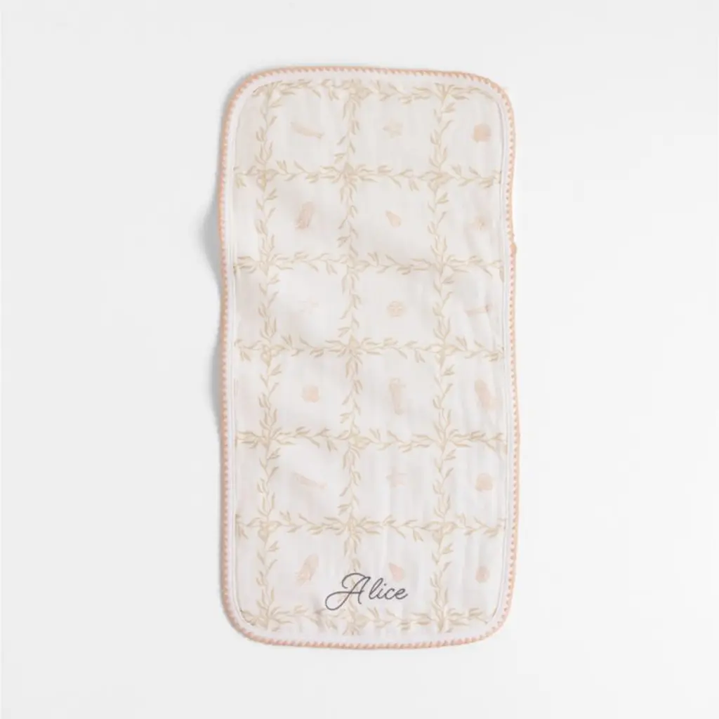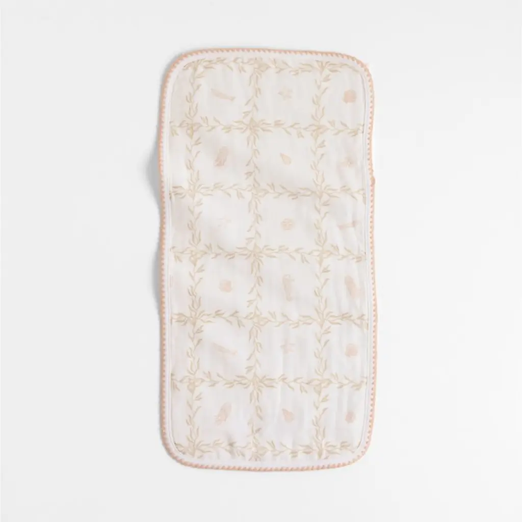 The basic burp cloth gets a major style lift from designer Jake Arnold. Our Frankie Seascape set includes a trio of designssolid white, ticking stripe, and a delicate, beachy seagrass motifall finished in an elevated blanket stitch trim. And while the burp cloths may look delicate, they work hard, thanks to their durable, 4-weave organic cotton gauze construction. Have them embroidered with a name or monogram for a gift that new parents will be delighted to reach for every day.For his first-ever baby & kids collection, exclusively at Crate & Kids, interior designer Jake Arnold was inspired by the dreamy childhood spaces he's created for A-list clients.