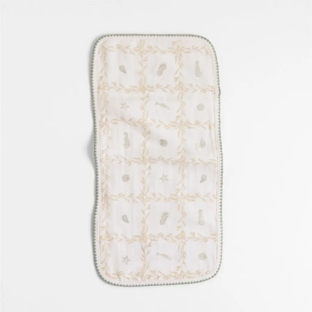 The basic burp cloth gets a major style lift from designer Jake Arnold. Our Frankie Seascape set includes a trio of designssolid white, ticking stripe, and a delicate, beachy seagrass motifall finished in an elevated blanket stitch trim. And while the burp cloths may look delicate, they work hard, thanks to their durable, 4-weave organic cotton gauze construction. Have them embroidered with a name or monogram for a gift that new parents will be delighted to reach for every day.For his first-ever baby & kids collection, exclusively at Crate & Kids, interior designer Jake Arnold was inspired by the dreamy childhood spaces he's created for A-list clients.