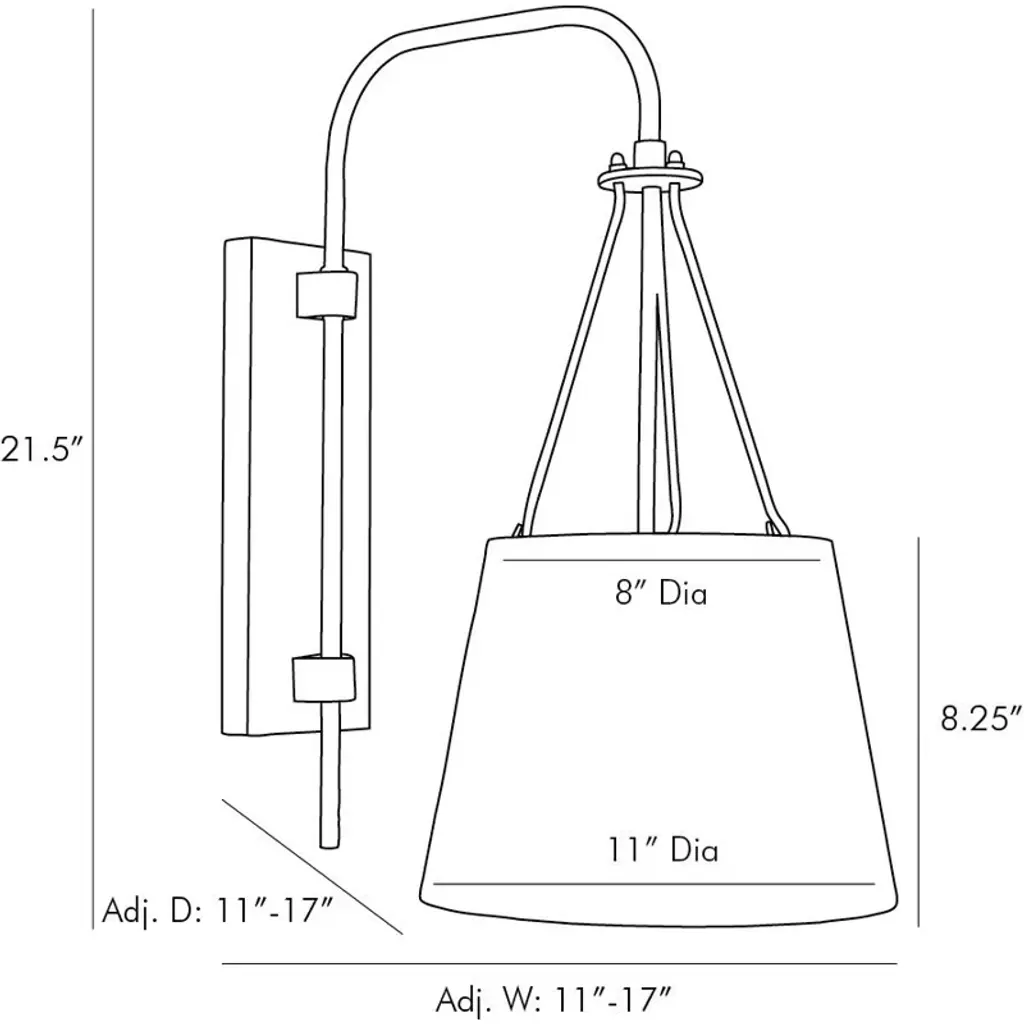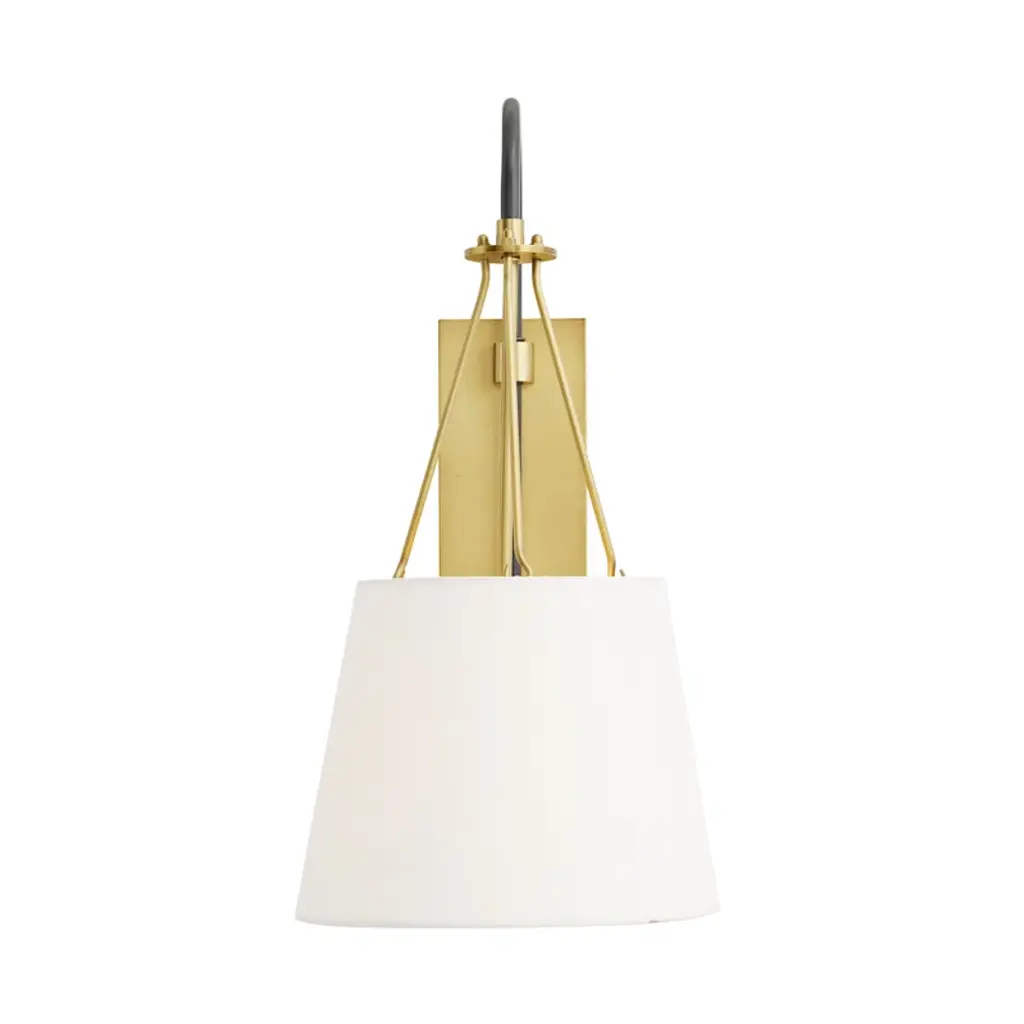 The sconce is suspended from a delicate metal framework with a modern metallic finish. Effortlessly appealing, it features an off-white drum shade in linen to softly diffuse its glow. Designer tip: display in pairs to flank a mirror, window, or doorway!