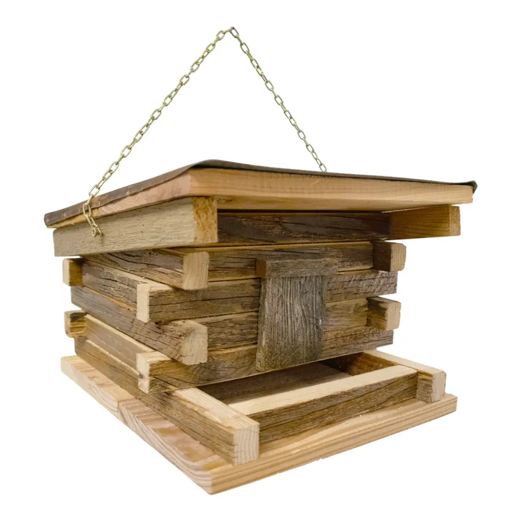 Invite feathered friends to feast in rustic style with our Franklin Log Cabin Hanging Bird Feeder. Expertly handcrafted from reclaimed wood, this feeder resembles a cozy log cabin with natural variations in color and texture that add unique character to every piece. The wide platform base provides ample space for birds to perch and dine, while the generous hopper holds plenty of seed to keep visitors coming back.A metal mesh roof offers protection from the elements, and the attached hanging chain makes it easy to display from a tree, shepherd’s hook, or porch beam.Made in the USA.