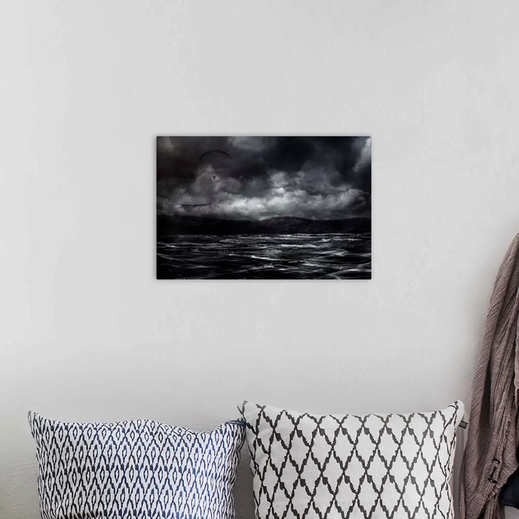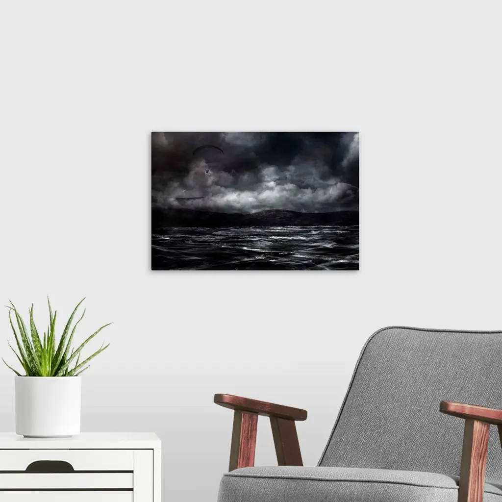 Low key, contrasting landscape photograph of two people paragliding over a mountain line and a rough ocean.