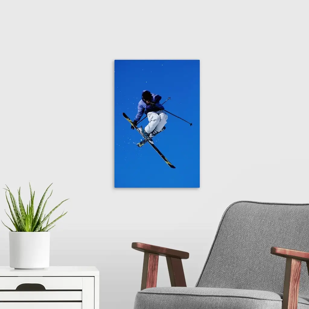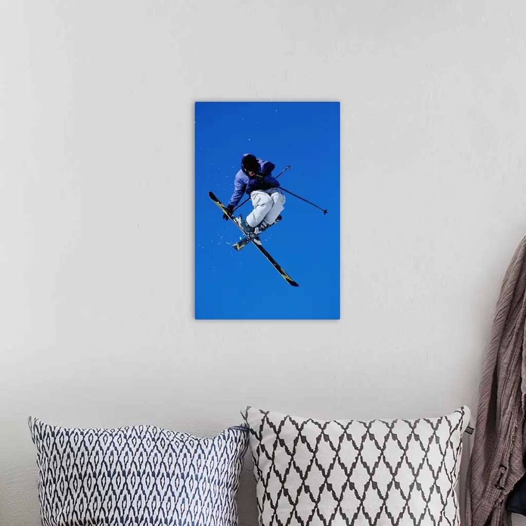 Free skier in mid-air jump, low angle view wall art for home and office decor. Discover canvas art prints, photos, mural, big canvas art and framed wall art in GreatBigCanvas.com's varied collections.