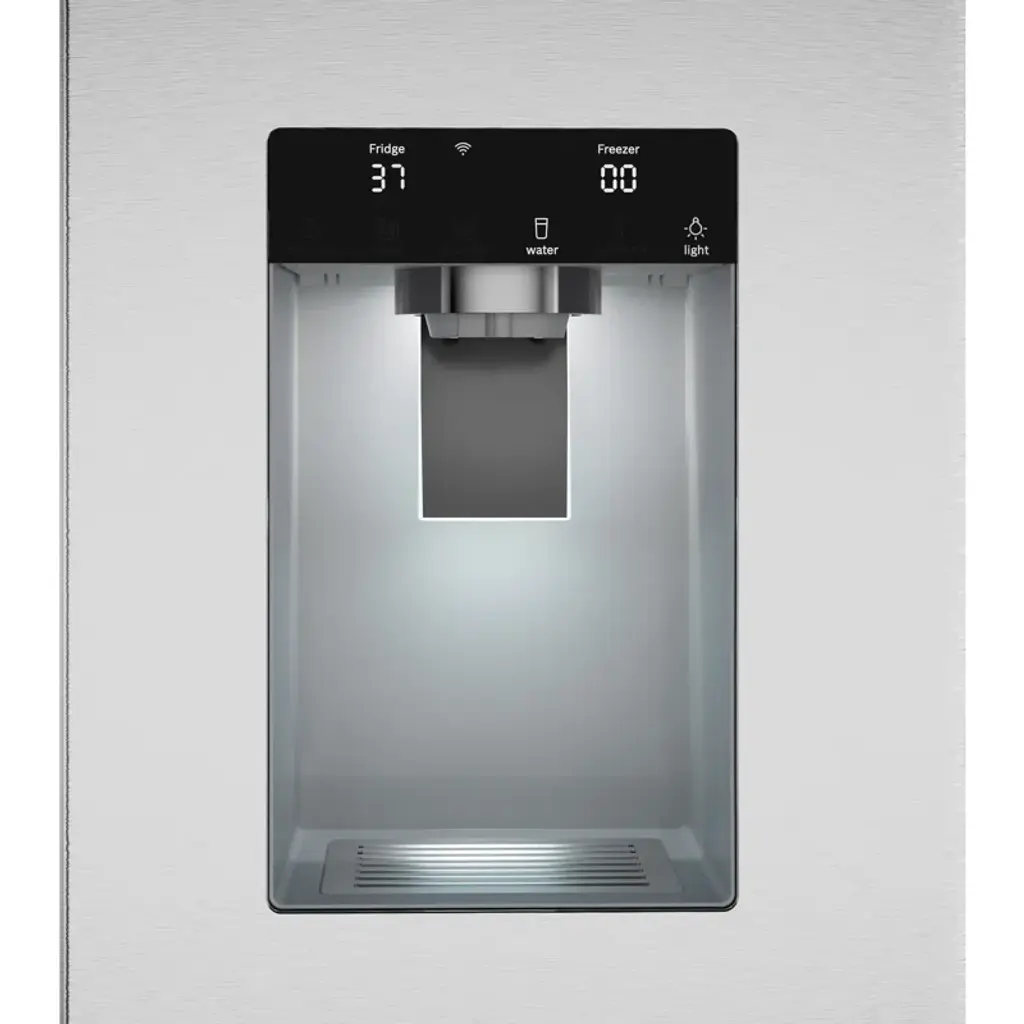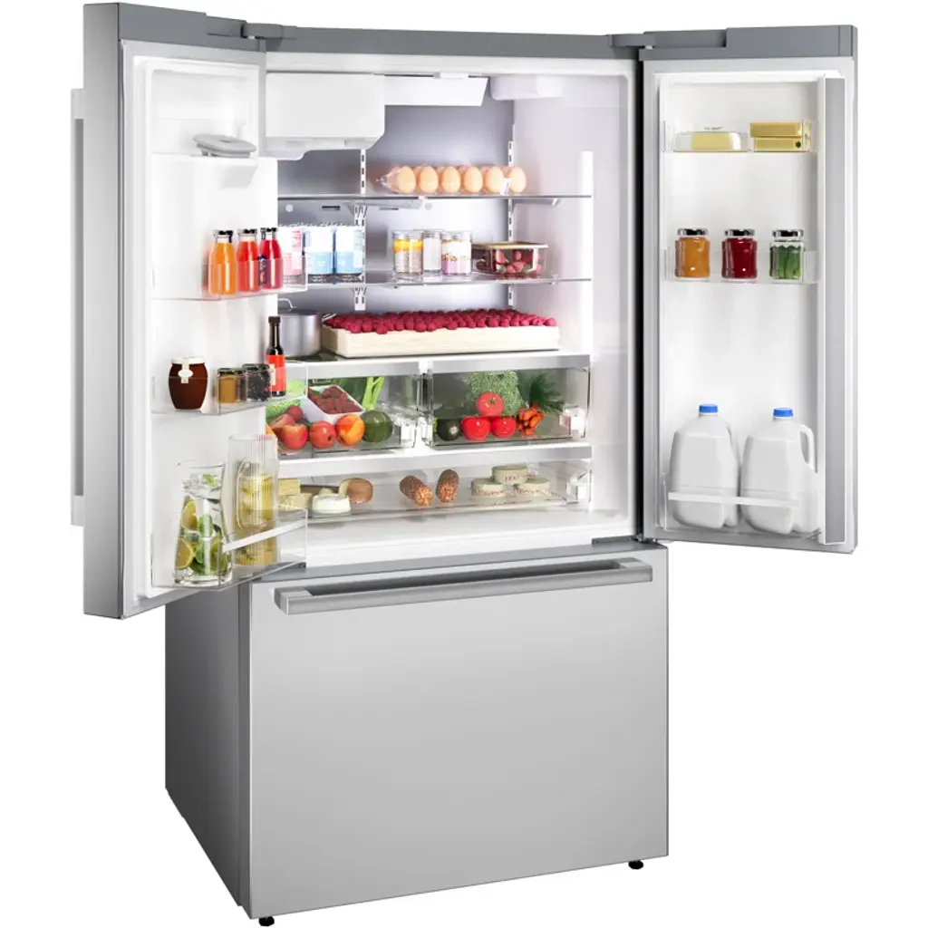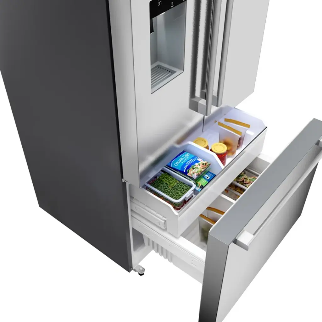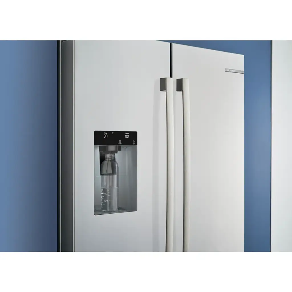 Never run out of ice with the QuickIce Pro System, the industry's fastest refrigerator ice maker, producing 12 lbs. of ice daily. The external ice and water dispenser accommodates oversized drink containers, plus easy water refill with one-touch bottle fill. Bosch's new anti-fingerprint stainless steel prevents smudges and fingerprints. Based on single ice maker production rates during 24 hours, measured per IEC standard and manufacturer user’s manuals, for brands identified in the US and Canada, TraQline is a freestanding French door bottom mount refrigerator.