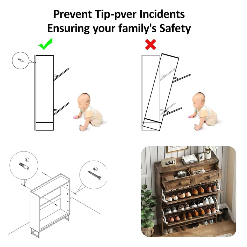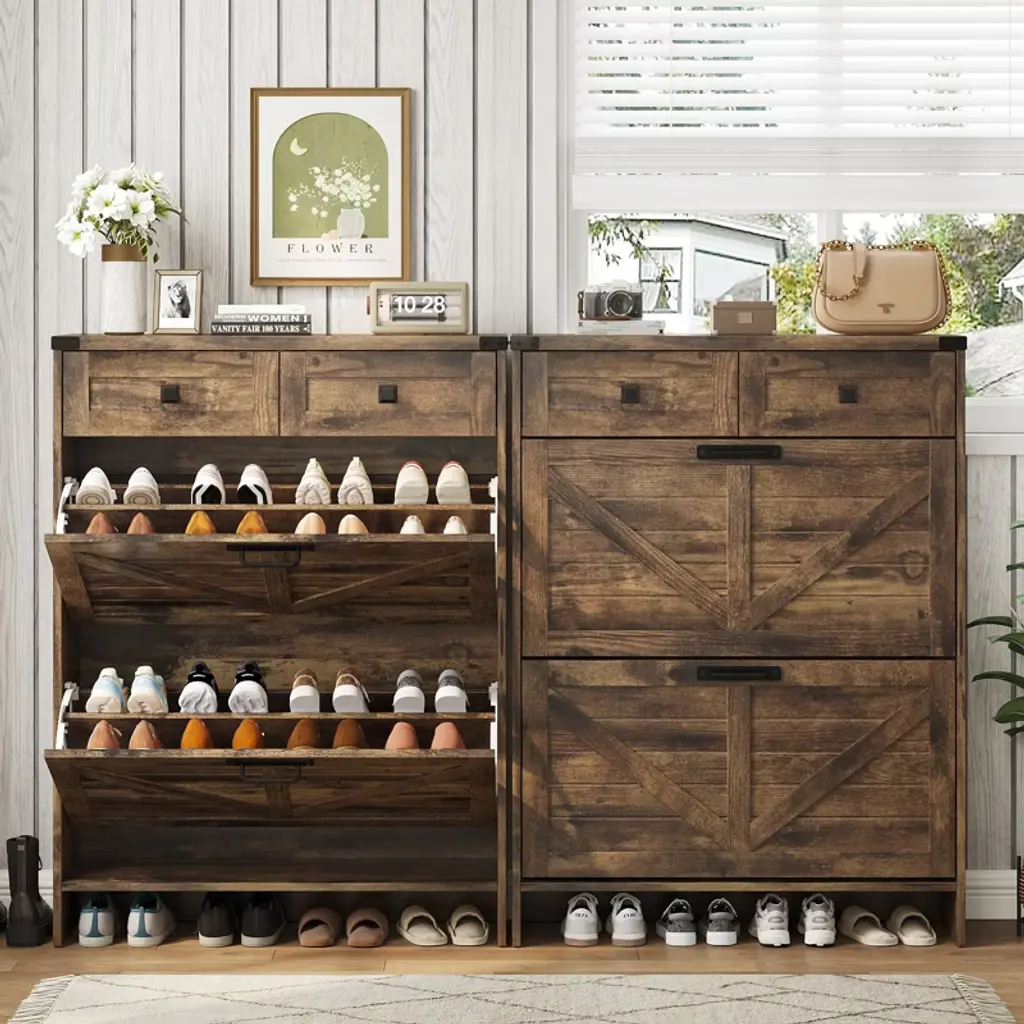 This farmhouse-style entryway shoe cabinet combines rustic charm with practical storage. Featuring 2 flip-top drawers (each with dual-tier space) and 2 standard drawers, it accommodates shoes and daily essentials like keys/wallets. The removable dividers adapt to various shoe sizes, while its slim profile fits narrow spaces. Finished in chic distressed white, it protects shoes from dust and pets. Ideal for hallways, porches, or living rooms, this space-saving cabinet maintains home neatness. Includes all hardware and clear assembly instructions for quick setup.