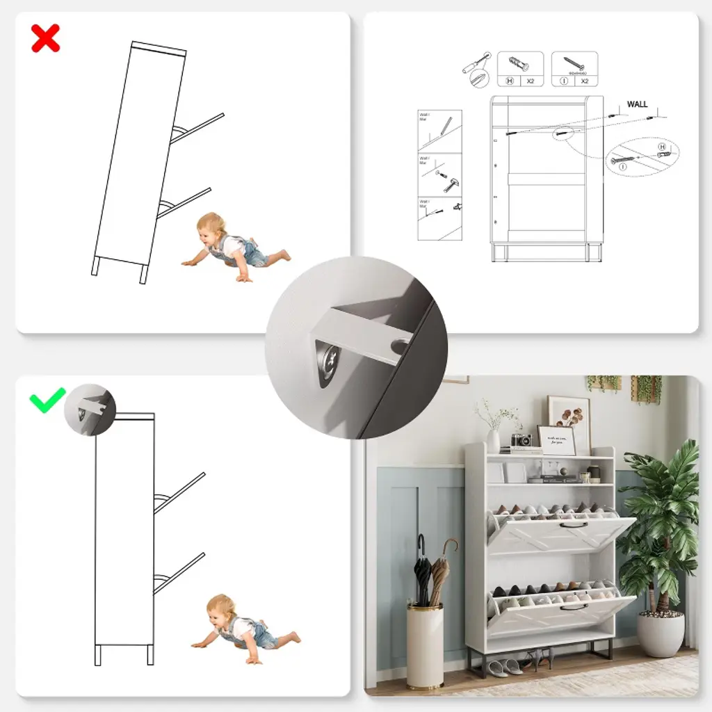 Maximizing narrow spaces at just 9.4" deep, this entryway cabinet stores 16-24 pairs vertically via flip-door drawers with adjustable tiers for boots/heels, while its fenced top shelf displays decor and secures keys. Engineered with wall-mounted anti-tip brackets and scratch-proof metal legs, the MDF construction ensures child/pet-safe durability. The open base accommodates robot vacuums or slippers, and tool-free assembly transforms cluttered hallways into streamlined vignettes.