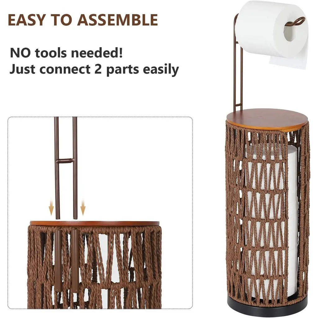 【FUNCTIONAL TOILET PAPER STORAGE】:This toilet paper stand provides instant storage for 3 rolls of extra toilet paper,3 rolls on storage towel and 1 roll on the paper dispenser.Combined structure of toilet paper roll holder and paper dispenser makes grabbing a reserve roll of toilet tissue quick and easy; Tissue holder ideal for small spaces where storage is limited, it tucks neatly beside or behind the toilet seat 【FREE STANDING DESIGN】This freestanding toilet paper holder is space saving and movable, the toilet paper holders with storage can be moved to a reachable place next to you and can be used in condos;Toilet paper holder stand perfect for bathrooms with no wall mount fixtures,Great for guest bathrooms, half baths, powder rooms, and smaller spaces where storage is limited,use the boho bathroom decor to create instant storage space. 【NATURAL METERIAL】Farmhouse toilet tissue paper holder made of natural, eco-friendly rattan adds to any decor.Measures 6.3" diameter x 15.7" high,Our toilet paper holder with shelf has a special weight gain base which ensures the tissue holder for bathroom will not fall over easily,so rolls are always clean, dry, and ready to use 【EASY TO ASSEMBLE】No tools or scres needed, simply connect the 3 parts: toilet paper basket, lid and roll storage holder. Save your time.toilet paper organizer features a lid to prevent dust.and the mid lid is a great bonus, which keeps your personal items like phone, wipes close to your hand. toilet paper stand holder also makes your bathroom cleaners, hand sanitizer accessible.