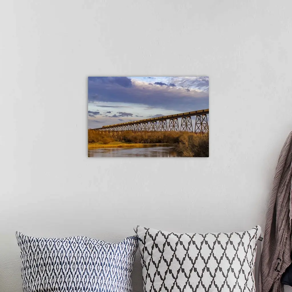 Freight train crosses Hi- Line Trestle over the Sheyenne River in Valley City, North Dakota, USA.