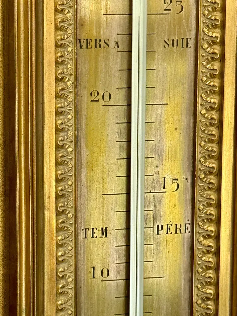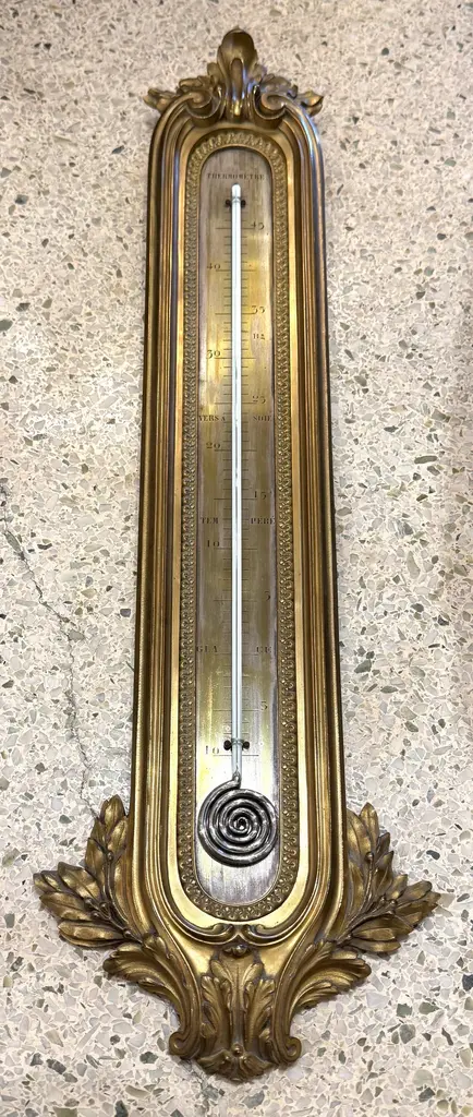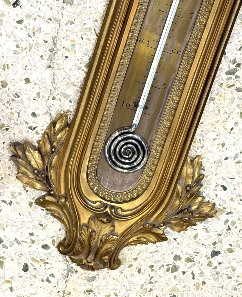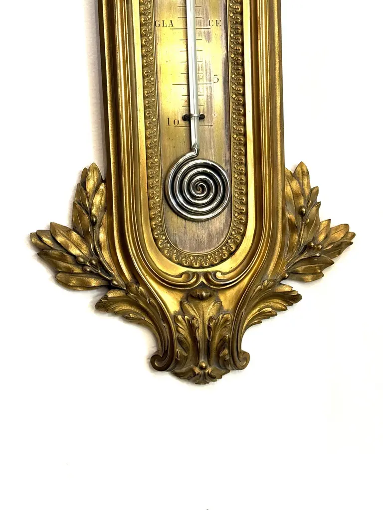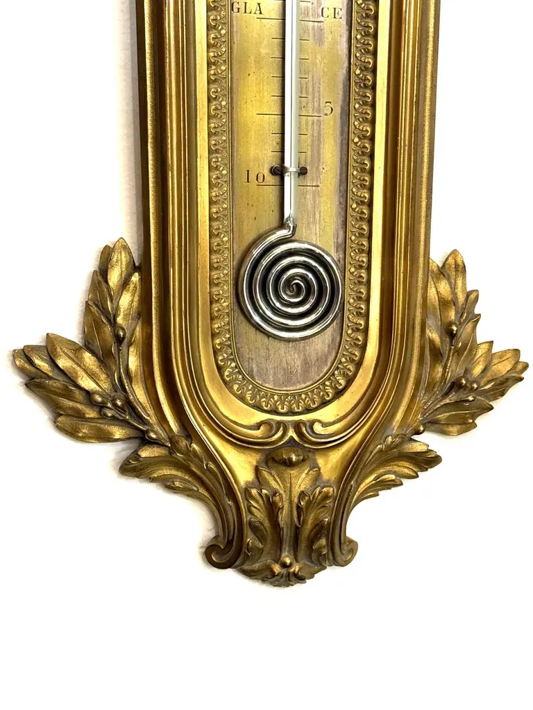 Original 19th Century wall mounted thermometer measuring in centigrade in the Louis XVI style. All bronze and very elegant thermometer attributed to François Linke. All weather markers are in French indicating some states in nature such as “Ice” at 0° Celsius. Bronze embellishments with volutes, acanthuses and oak leaves.