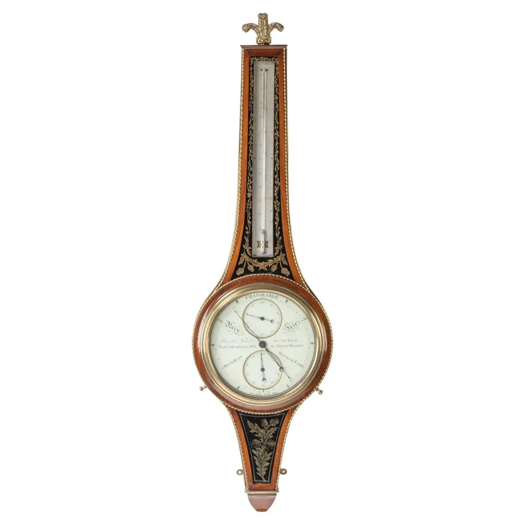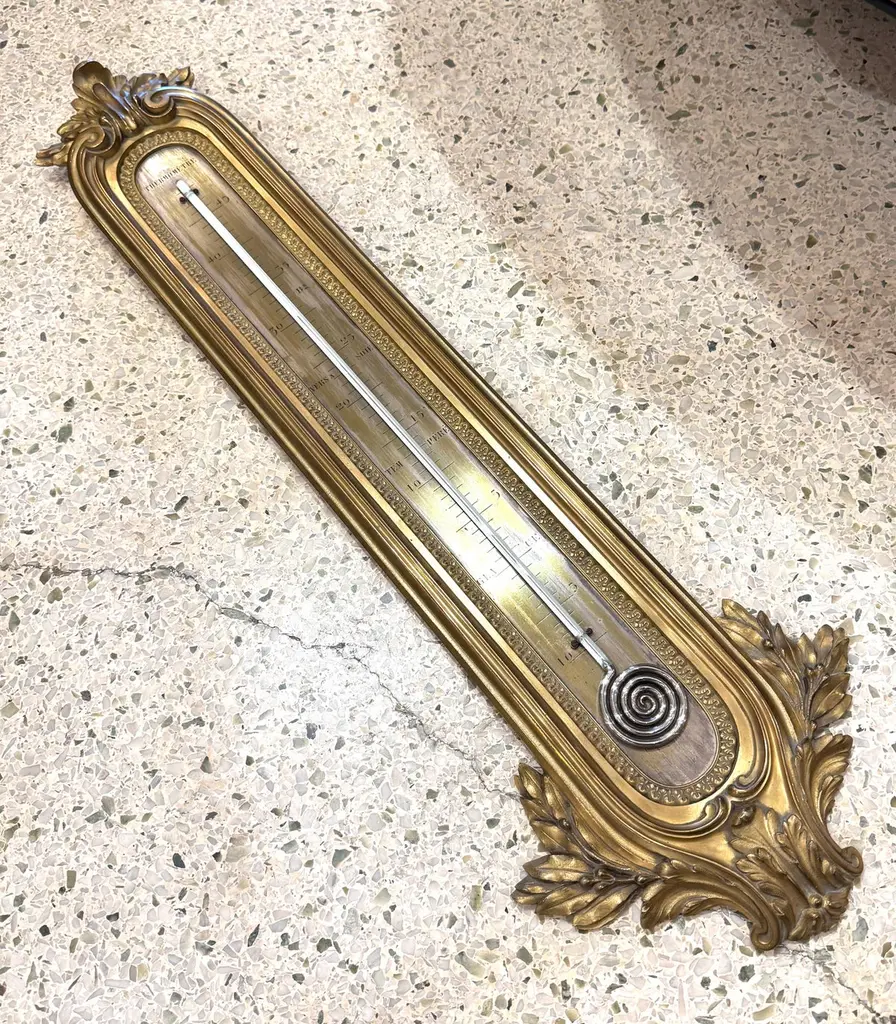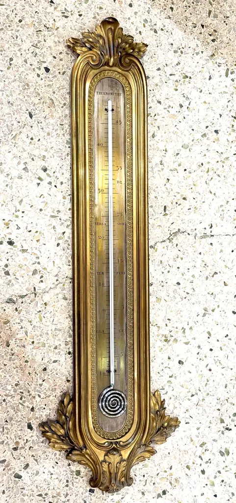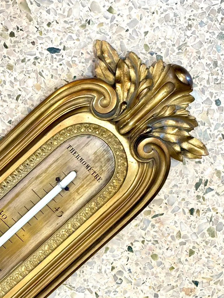 Original 19th Century wall mounted thermometer measuring in centigrade in the Louis XVI style. All bronze and very elegant thermometer attributed to François Linke. All weather markers are in French indicating some states in nature such as “Ice” at 0° Celsius. Bronze embellishments with volutes, acanthuses and oak leaves.