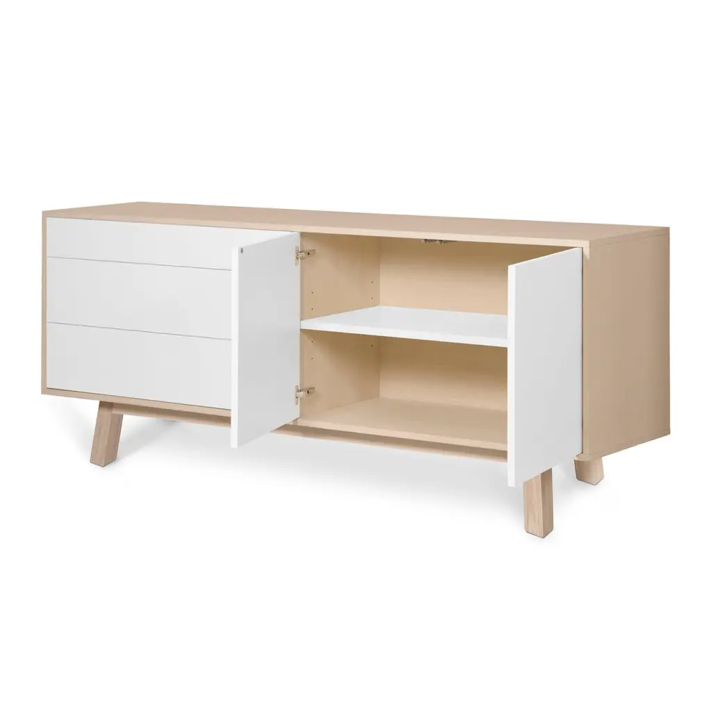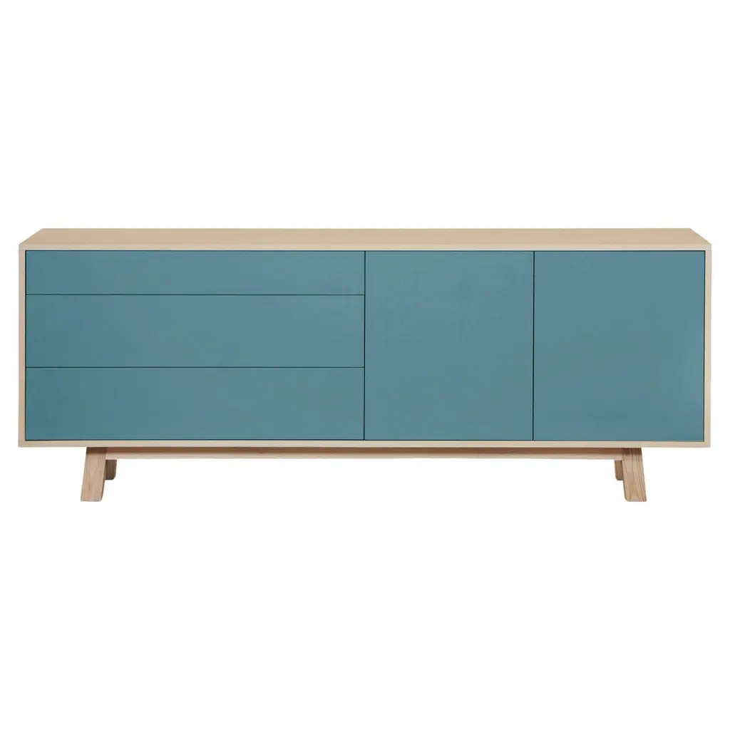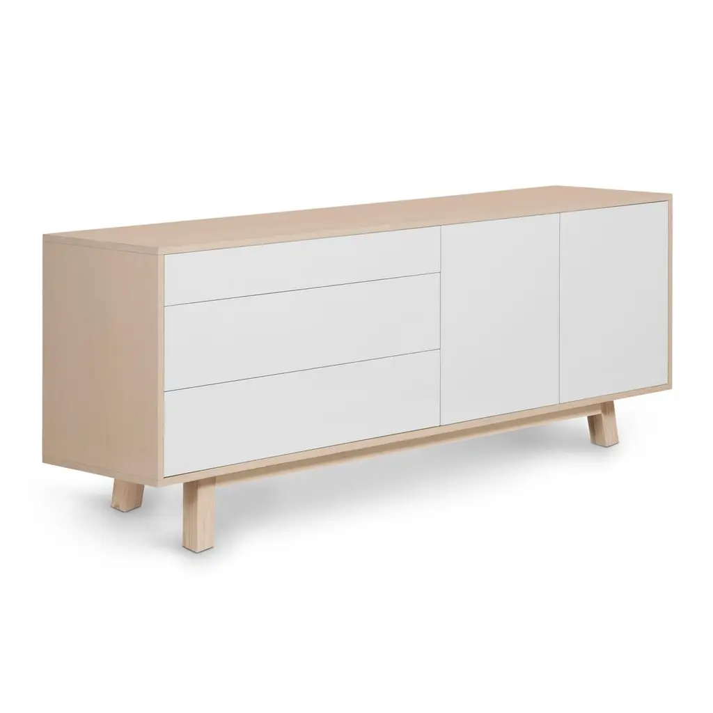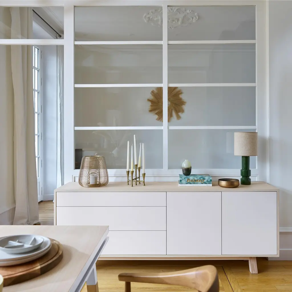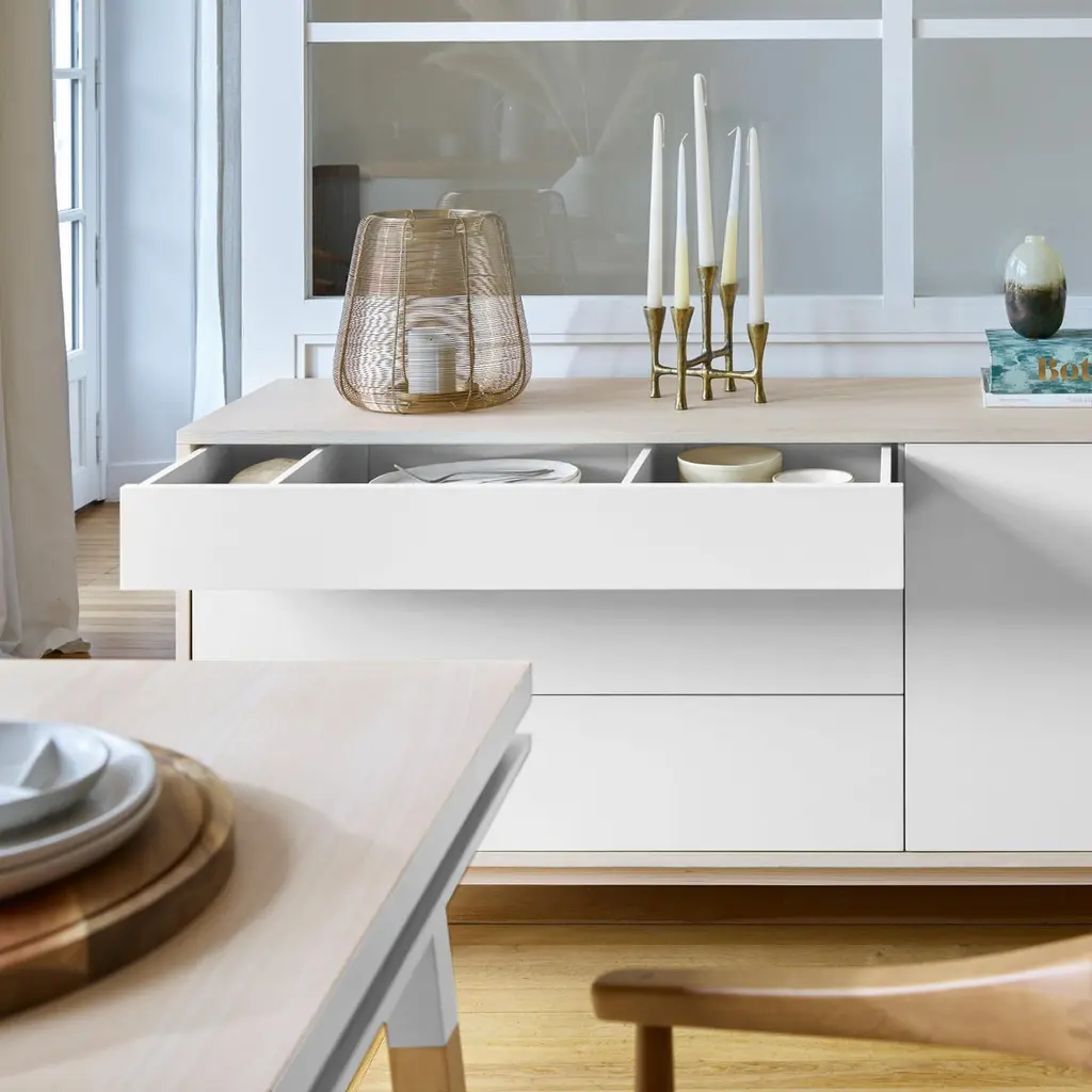 This 2-door, 3-drawer sideboard is presented here in ash wood and also available in French oak.No assembly is required from your side, the furniture is fully mounted in our workshop.The 3 drawers take up half the total length. The drawers fronts are solidly assembled with dovetail joints. The top drawer is lower than the other 2 and features 2 removable interior wooden dividers. The 2 lower drawers are normal drawers without dividers. Behind the 2 hinged doors, 1 height-adjustable shelf on cleats is supplied with the sideboard. To prevent damage during transport, it is positioned at the bottom of the buffet. All you have to do is place it on the cleats (supplied) at the desired height upon reception. Doors and drawers open with a « push & release » pressure on front.ÉGÉE COLLECTIONThis large & low 2-door 3 -drawer sideboard is part of the ÉGÉE collection, designed by the Parisian designer Eric GIZARD who here adopts the refined codes of Scandinavian design. combining natural materials, elegance and sobriety of lines by adding very beautiful muted and "trendy" colors.Inside the ÉGÉE collection, the KUBE concept is designed to offer an optimized and aesthetically pleasing storage concept.MON PETIT MEUBLE FRANÇAISoffers you 100% French products. The solid wood comes exclusively from sustainably managed French forests.The manufacture and finishes are of very high quality, carried out in French workshops in Mayenne, France.